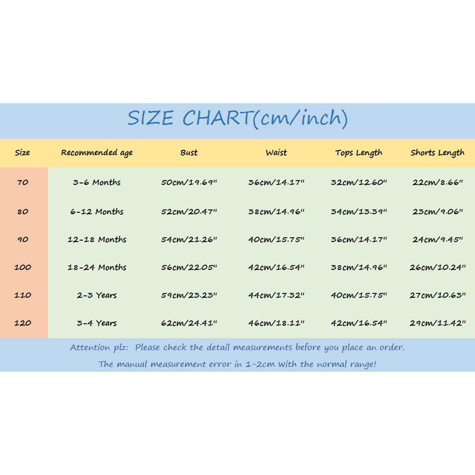 Размер: 70 Рекомендуемый Возраст: 3-6 месяцев Бюст: 50 см/19,69 дюйма Талия: 36 см/14,17 дюйма Длина топа: 32 см/12,60 дюйма Длина Шорт: 22 см/8,66 дюйма