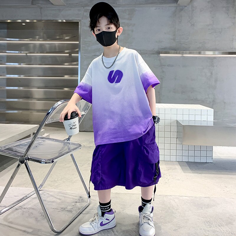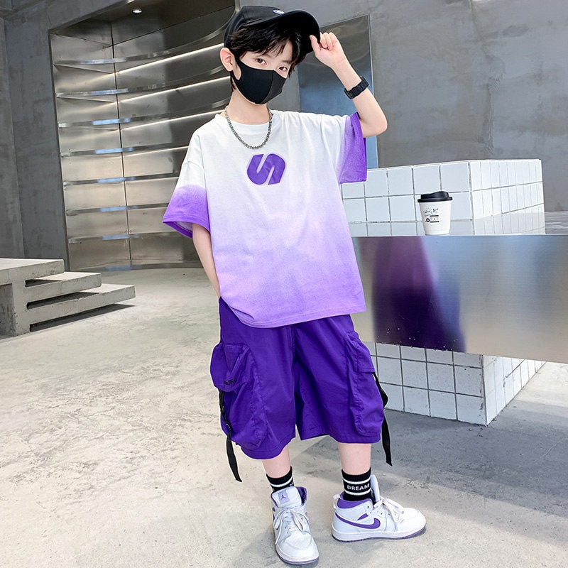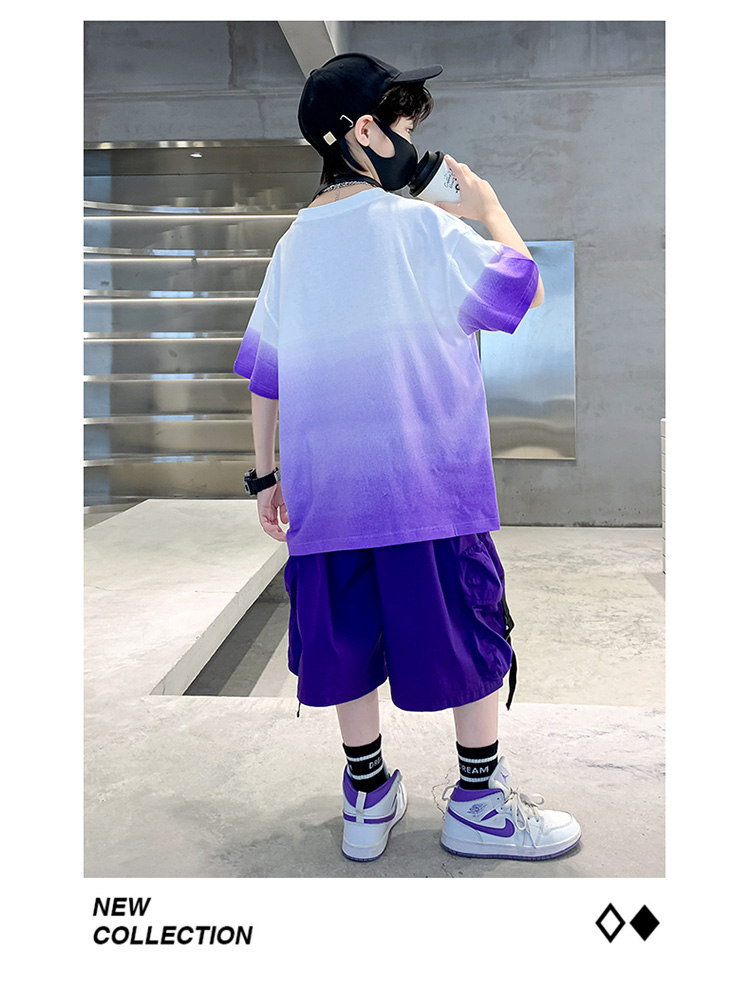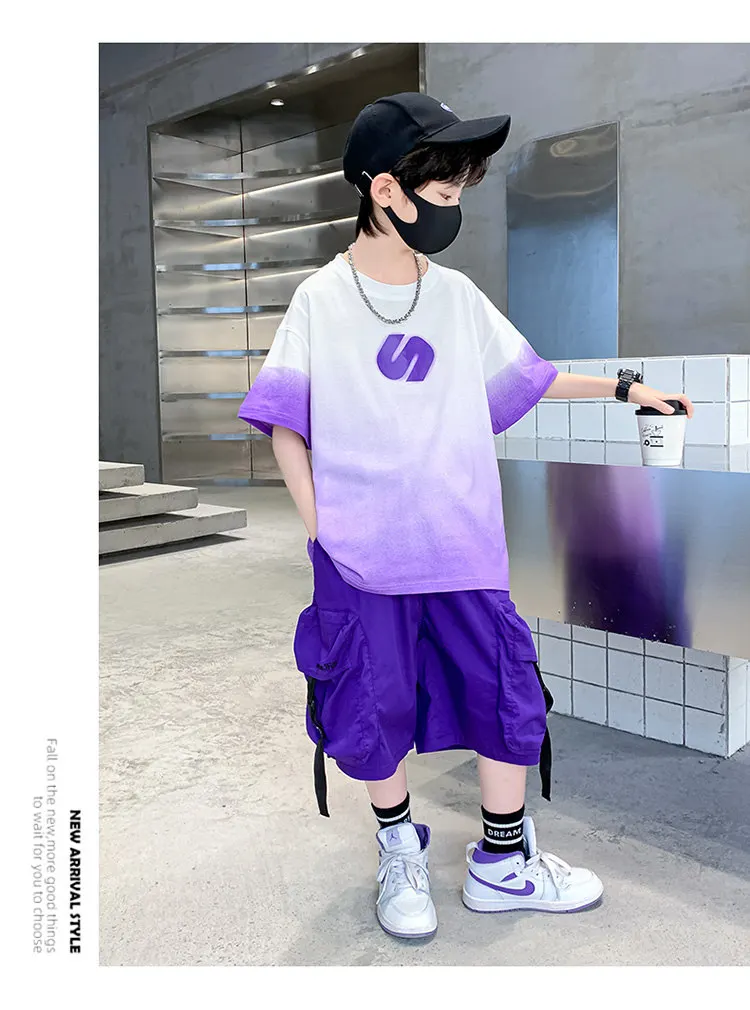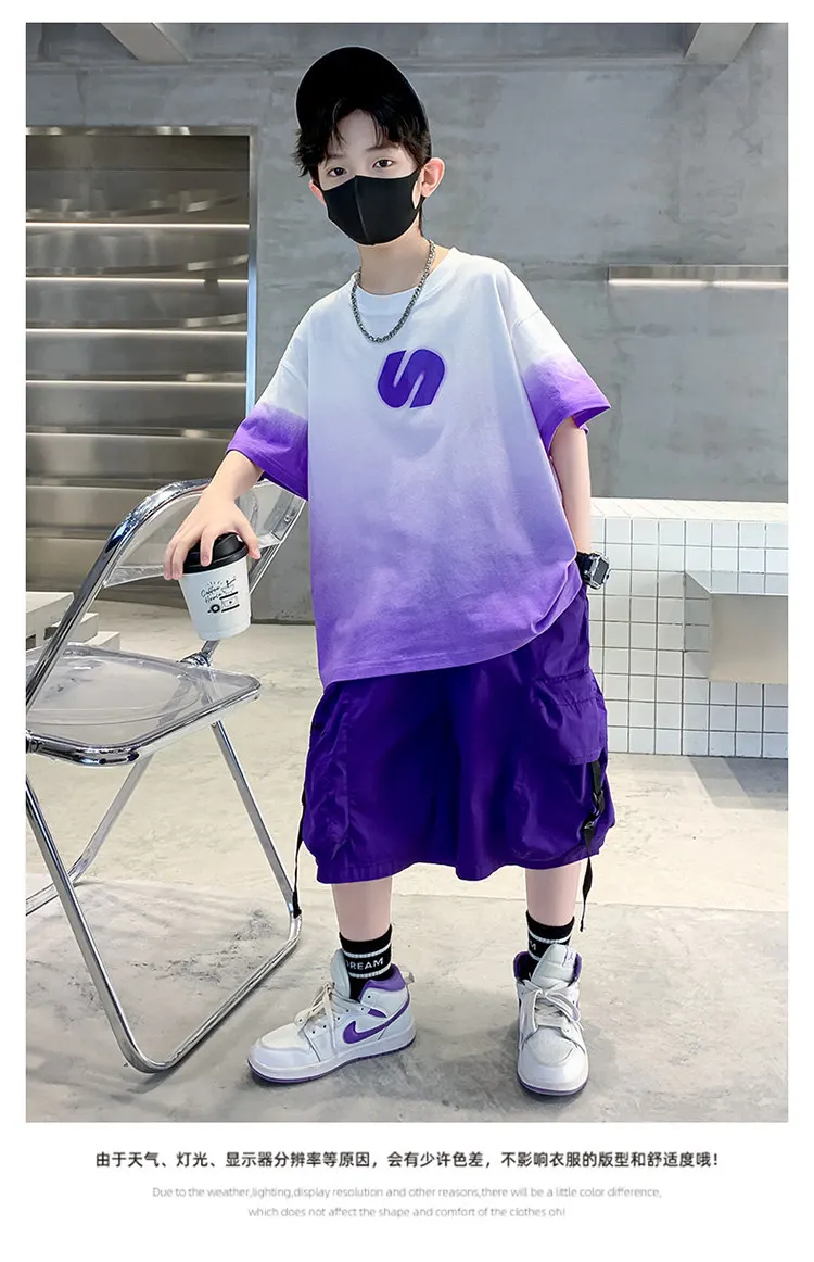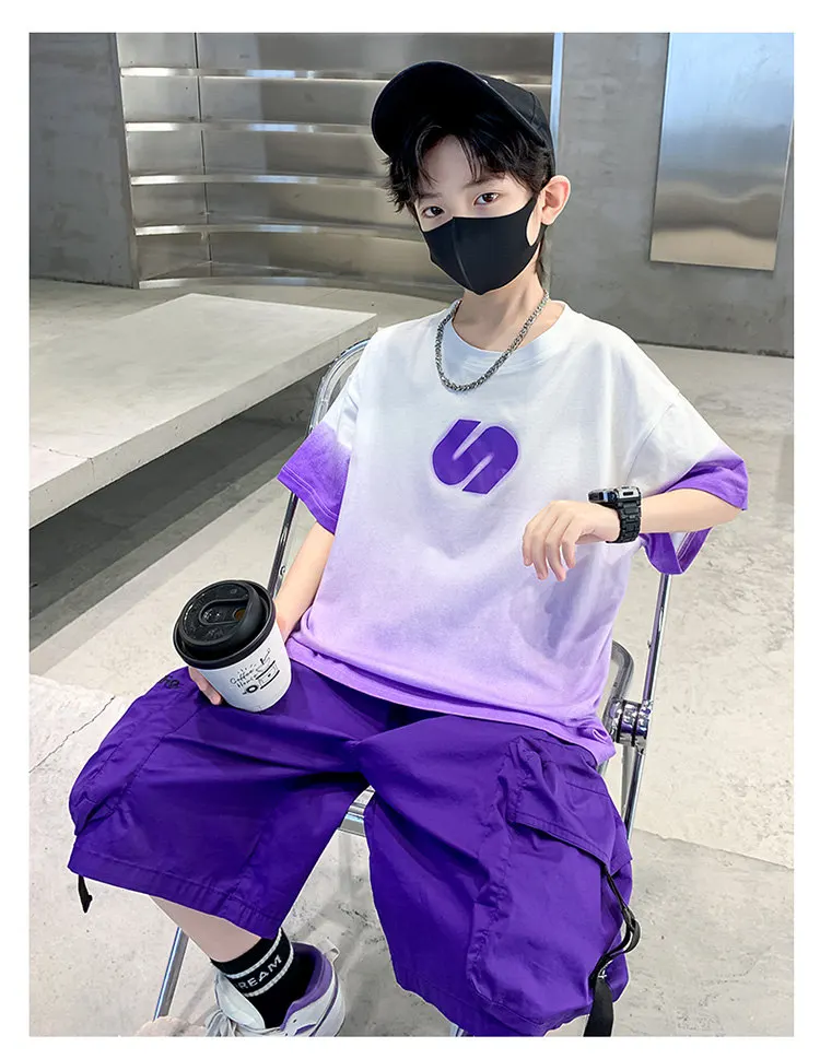 Летняя одежда для больших мальчиков, детские футболки фиолетового зеленого цвета с короткими рукавами, топы + шорты, костюм, хлопковые наряды для подростков, 5 7 9 11 13 14 лет
