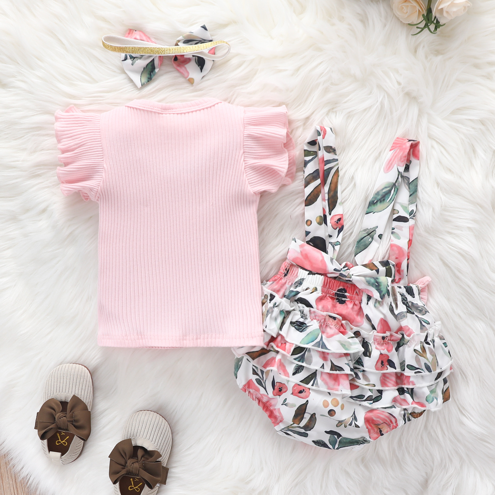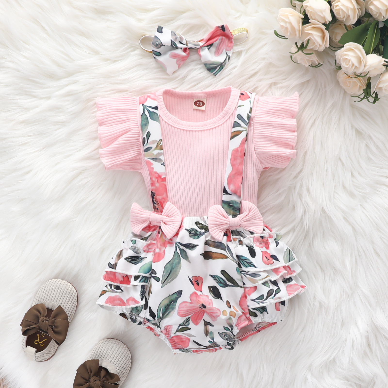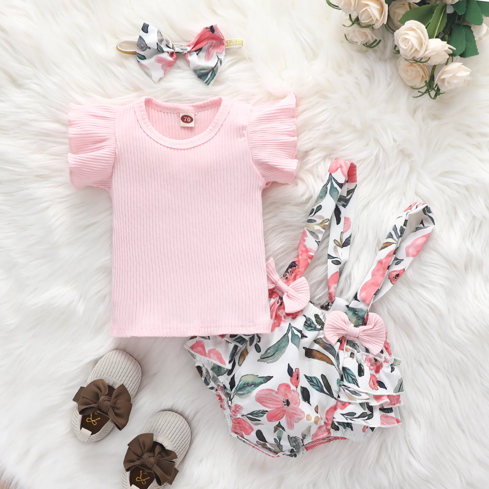 Футболка с рукавом в полоску + Бант на подтяжках, на Возраст 3-12 месяцев