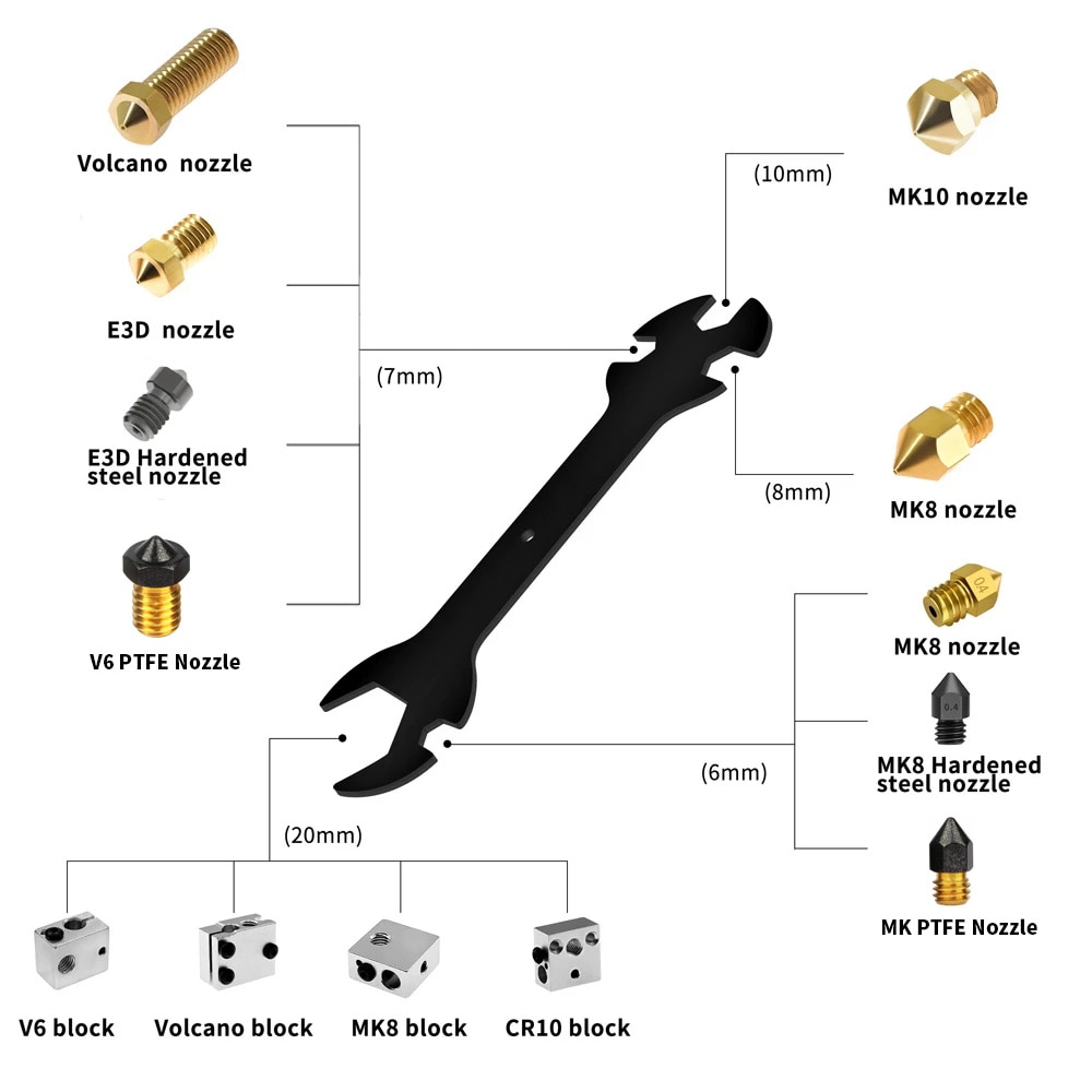 Гаечный ключ 5 в 1, части 3D-принтера, сопло, гаечный ключ 6 мм до 20 мм, стальной гаечный ключ, плоский для Ender 3 E3D MK8 MK10, сопло, инструмент