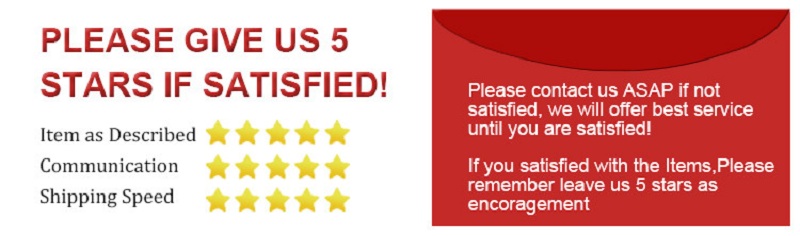 1. Пожалуйста, оставьте 5 звезд отзывы, если вы удовлетворены нашей продукцией и обслуживанием, Мы будем признательны (товар, как описано 5 звезд, связь 5 звезд, время доставки 5 звезд).