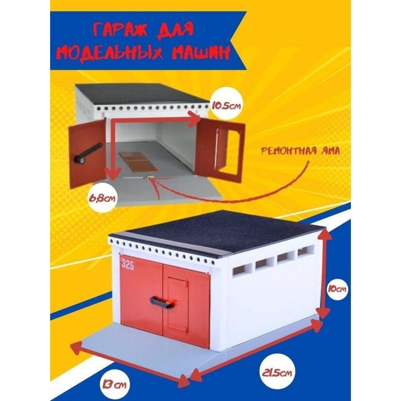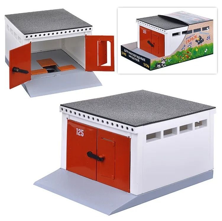 Описание: Гараж подходит для игры масштабными машинками (от 1/43 до 1/36). Ворота и калитка открываются. Настил ремонтной ямы снимается. Гараж легко собирается и разбирается как конструктор. Из нескольких гаражей можно создать гаражный кооператив (без отверток и гаечных ключей).
