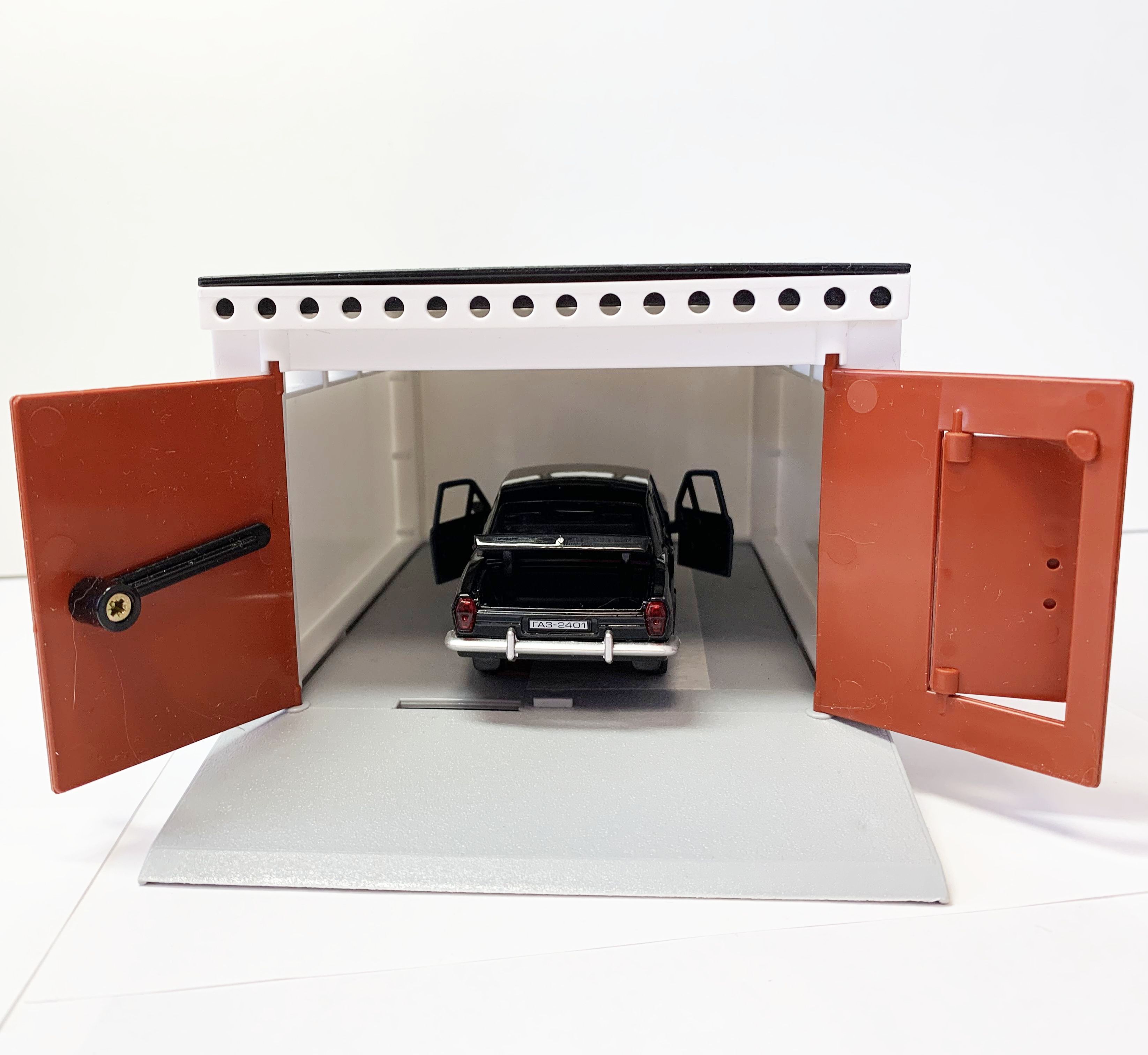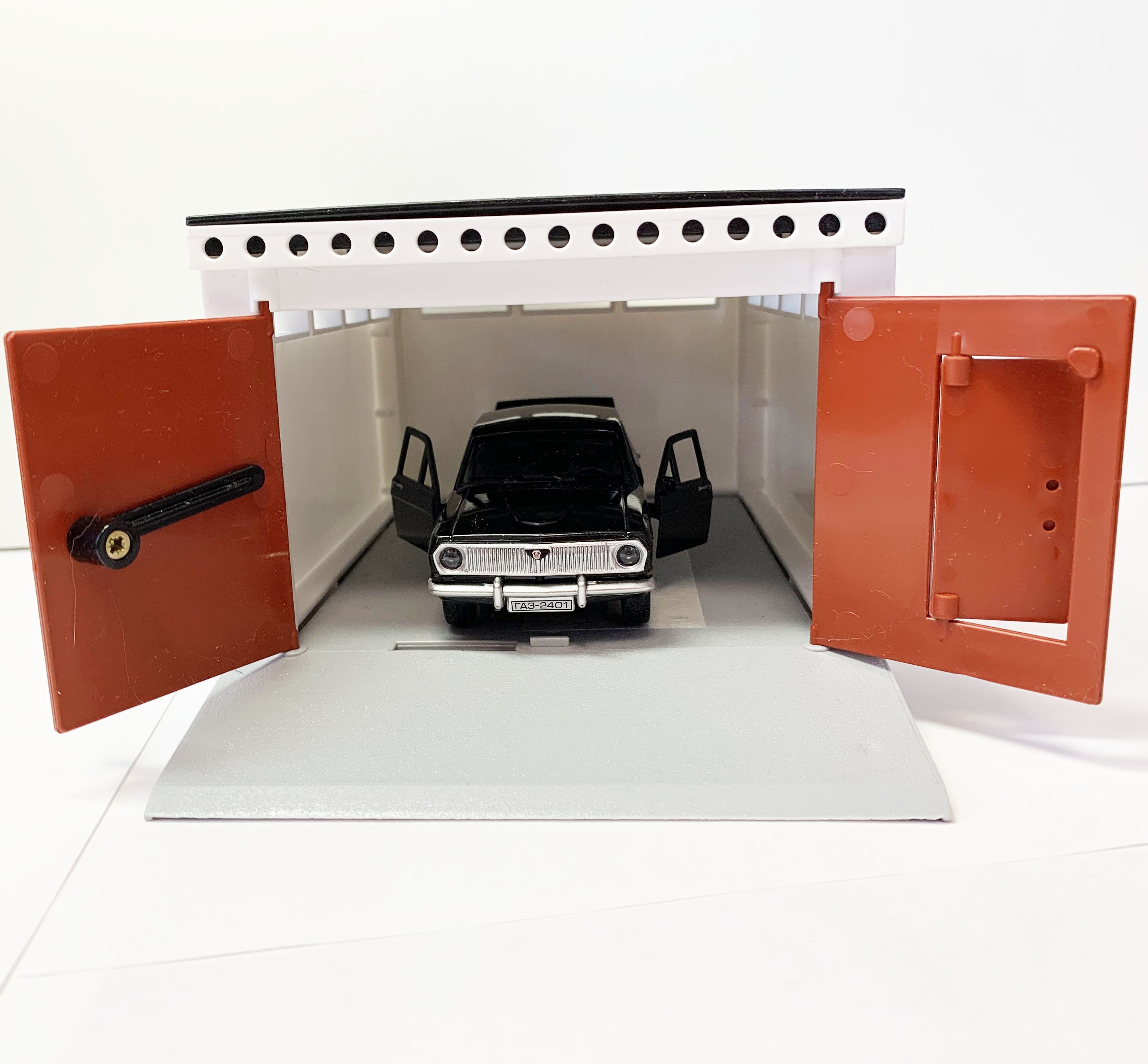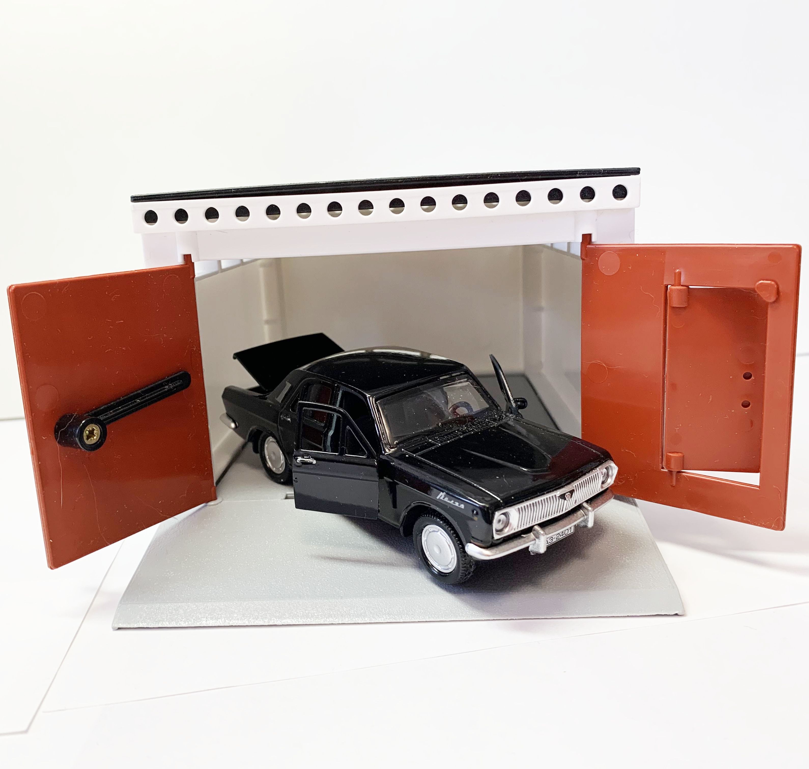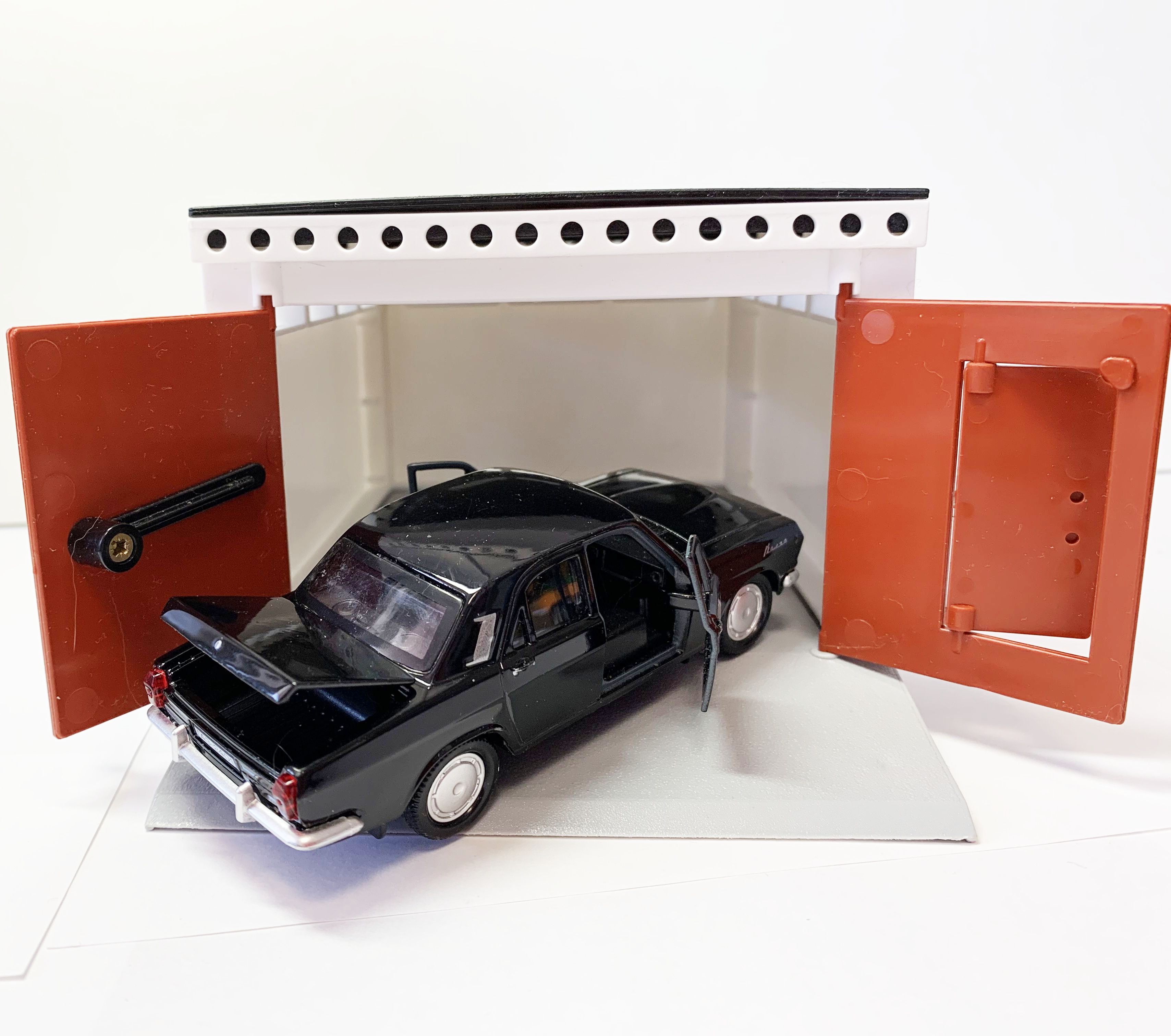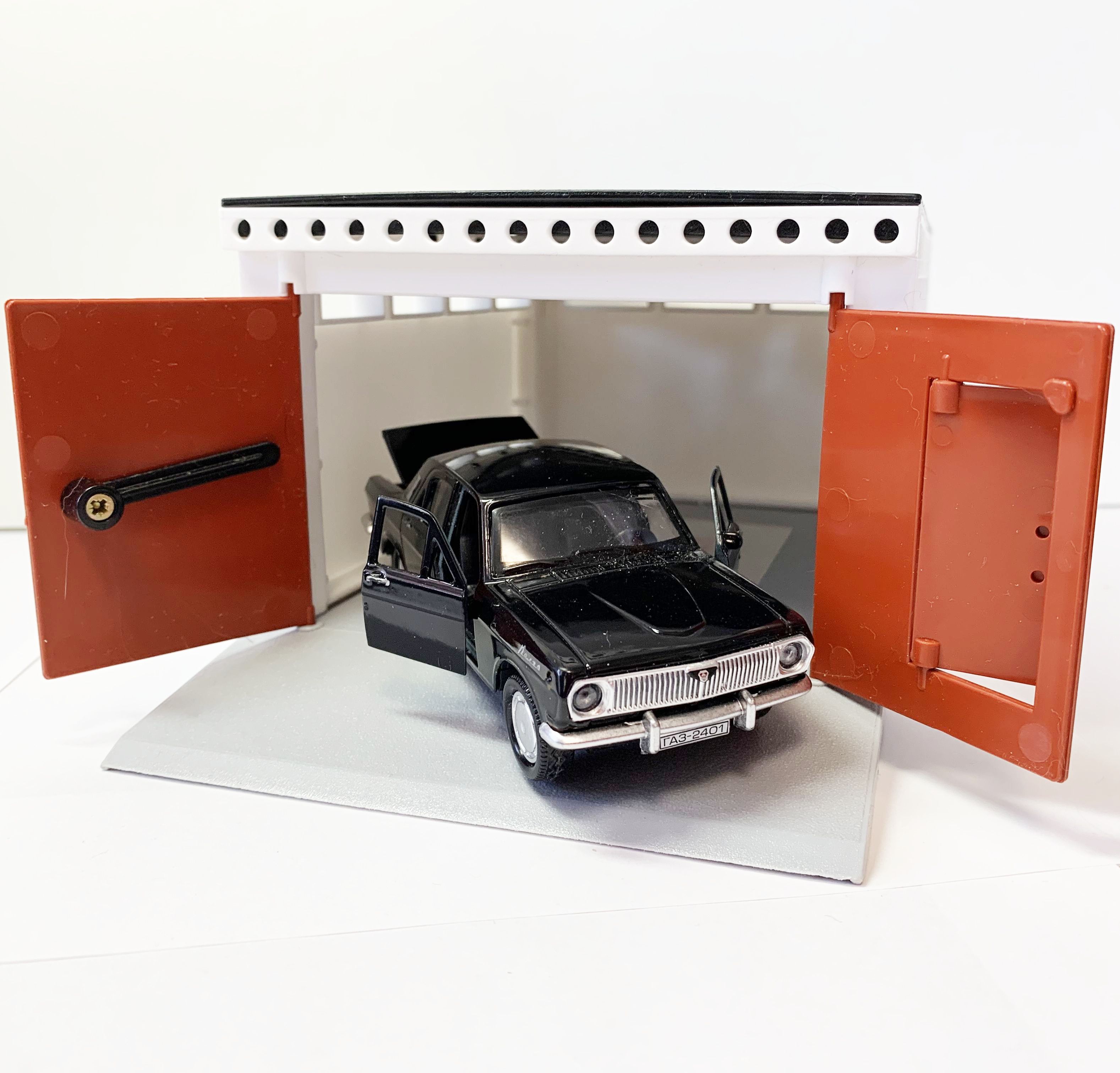 Описание: Набор - игрушечный разборный гараж с распашными воротами и металлическая инерционная ретро машинка СССР с открывающимися дверями.