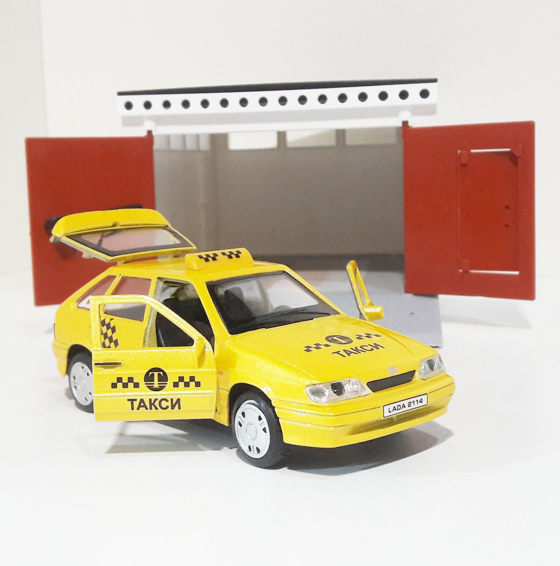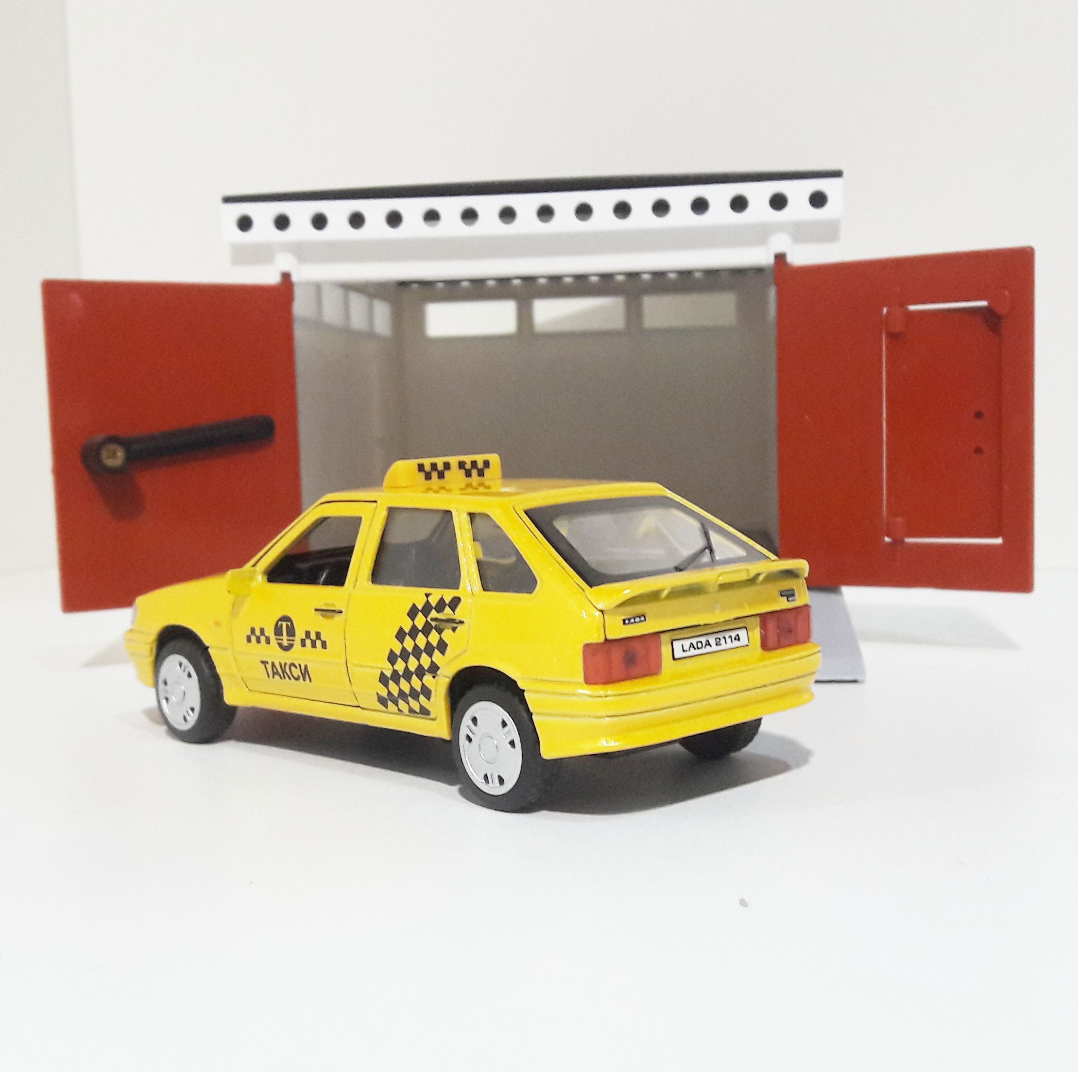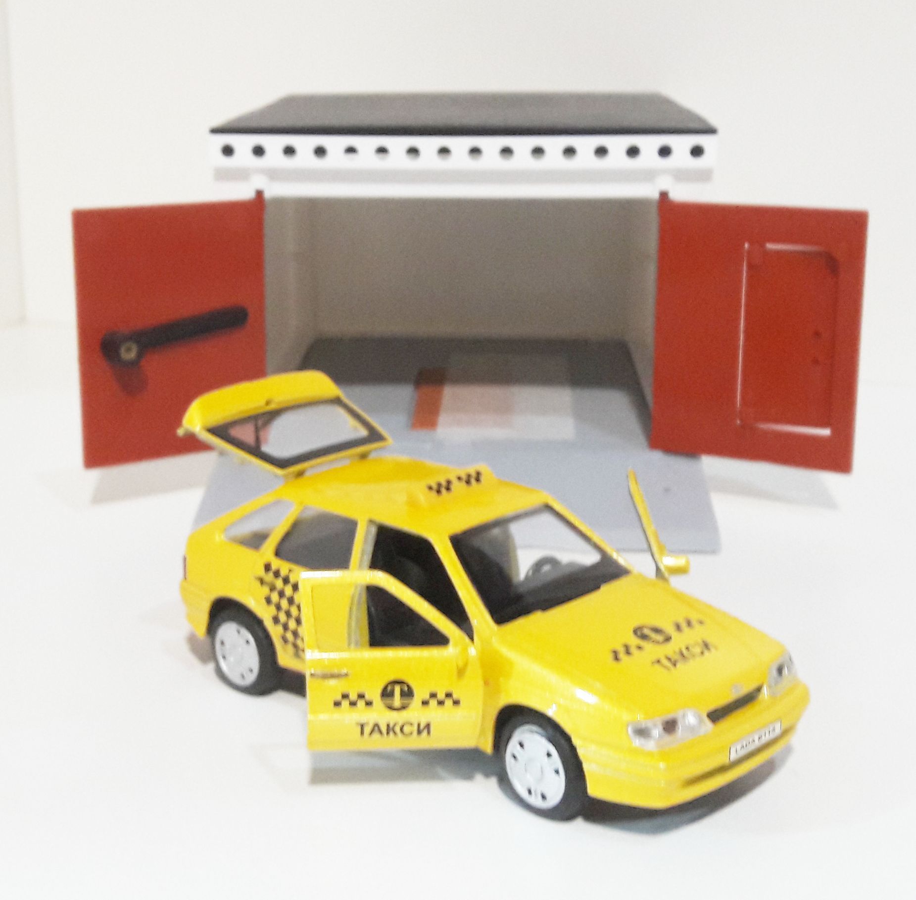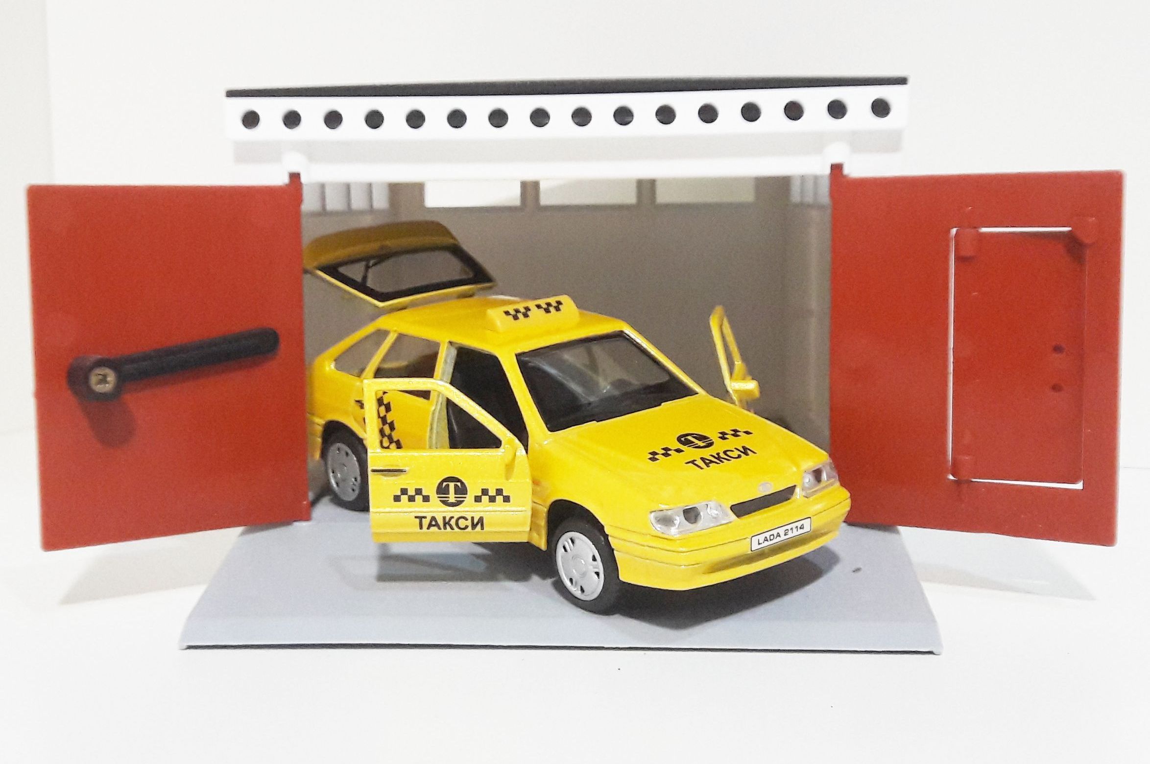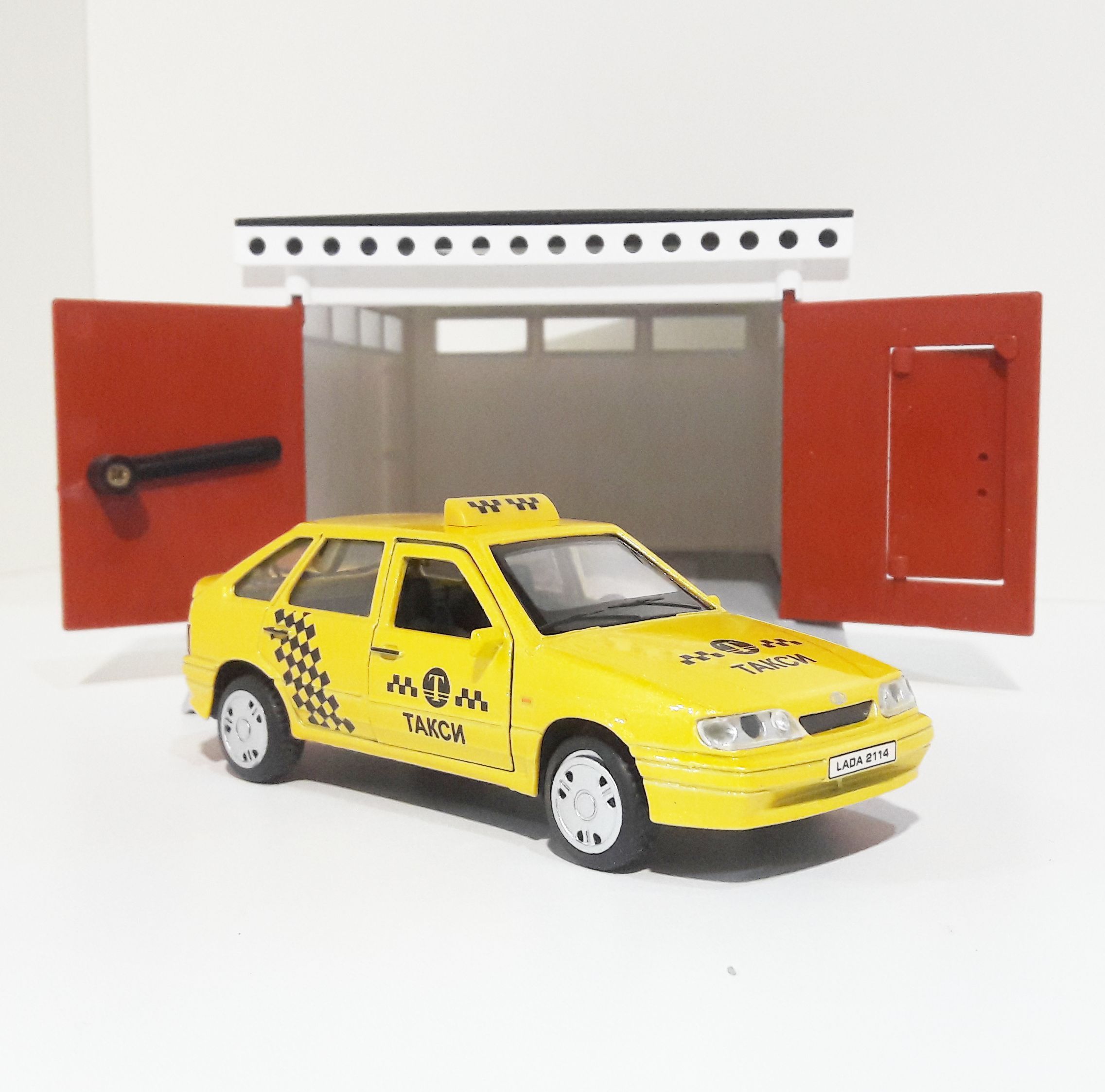 Гараж с распашными воротами и металлическая инерционная машинка ВАЗ 2114 с открывающимися дверями и багажником (такси)