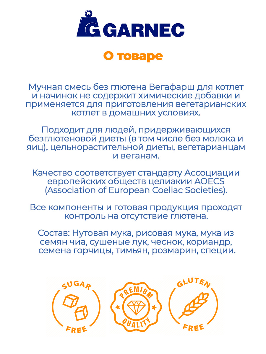 Описание: Мучная смесь без глютена Вегафарш для котлет и начинок не содержит химические добавки и применяется для приготовления вегетарианских котлет в домашних условиях. Подходит для людей, придерживающихся безглютеновой диеты (в том числе без молока и яиц), цельнорастительной диеты, вегетарианцам и веганам. Качество соответствует стандарту Ассоциации европейских обществ целиакии AOECS (Association of European Coeliac Societies). Все компоненты и готовая продукция проходят контроль на отсутствие глютена.