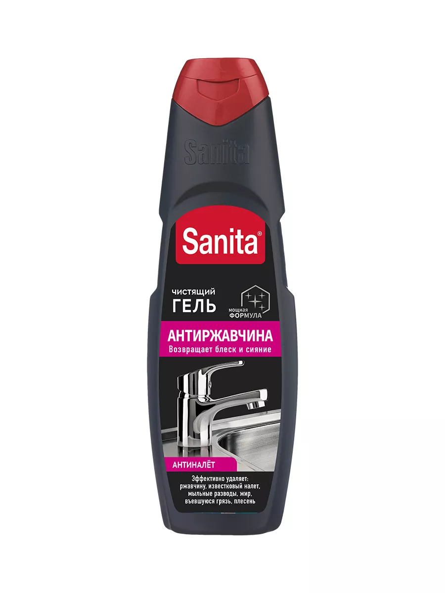 Описание: Гель-очиститель ржавчины Sanita. Средство подходит для чистки сантехники, кафельной плитки, поверхностей кухни, туалета, ванной комнаты. Гель эффективно удаляет ржавчину, известковый налет, мыльные разводы, въевшуюся грязь. Средство смывается водой, не оставляет разводов. Выгодная покупка: 4 геля антиржавчина. Способ применения средства. Унитазы, душ, краны: нанести средство, при необходимости выдержать 5-10 минут, очистить с помощью щетки, смыть. Фаянсовые раковины, плитка: обработать гелем загрязненные поверхности с помощью щетки, через минуту тщательно смыть водой.