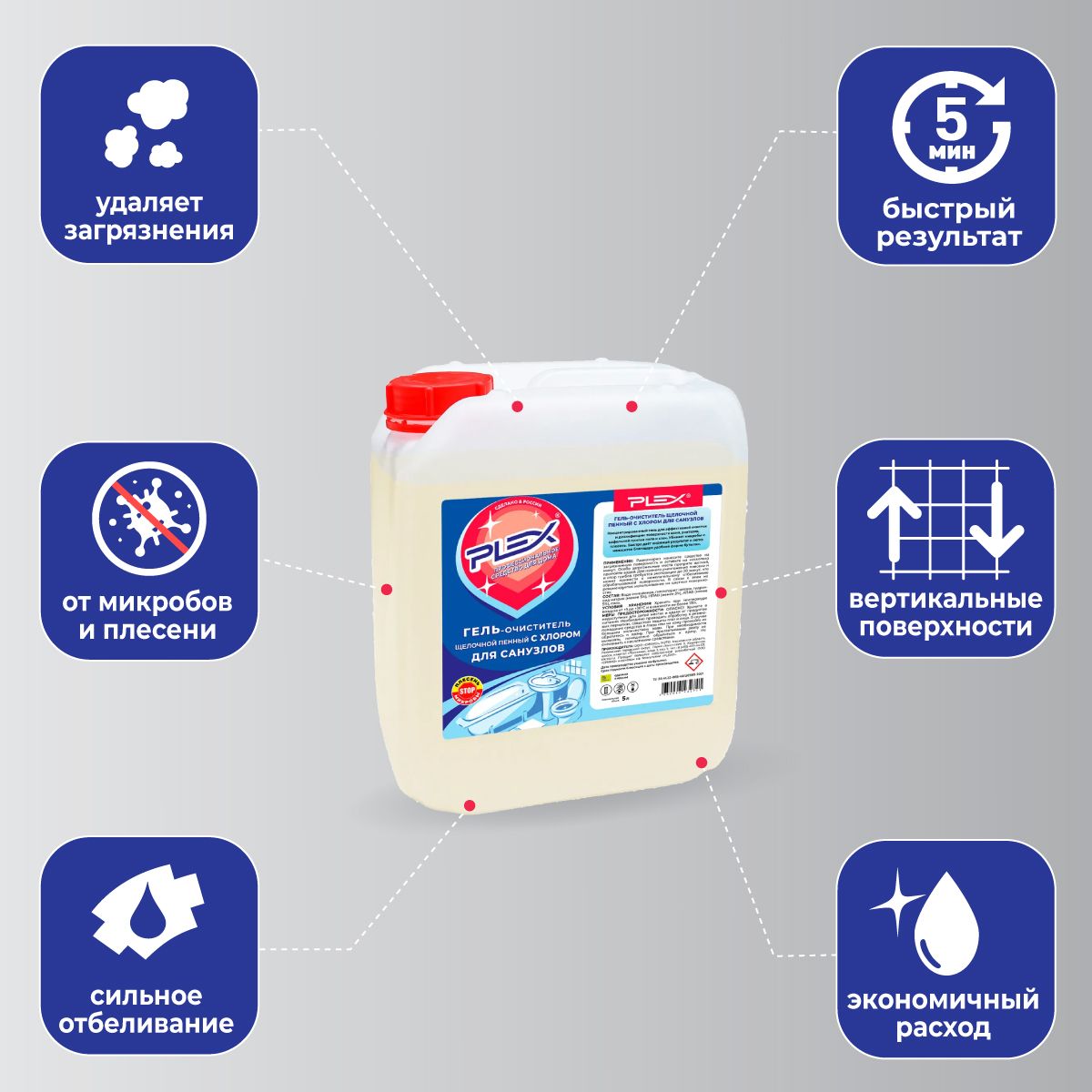 ДЕЗИНФЕКЦИЯ И ЧИСТКАЧистота – залог здоровья. Поэтому крайне необходимо постоянно поддерживать чистоту в ванных комнатах и санузлах. Средство для чистки и дезинфекции PLEX предотвращает развитие бактерий, плесени, грибков, устранение неприятных запахов, отбеливание, удаление органических и мыльных загрязнений, жира с различных водостойких поверхностей: полов, унитазов, биде, раковин, сантехники, облицовочной плитки.