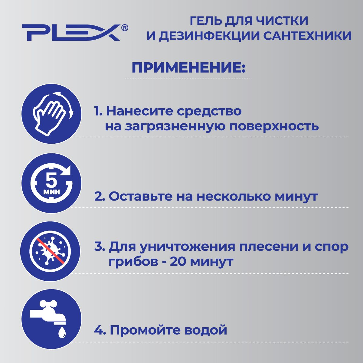 Чтобы не тратить много времени на домашнюю уборку, борьбу с плесенью, оттирание въевшихся пятен необходимо воспользоваться качественной линейкой бытовой химии PLEX для очистки и дезинфекции сантехники, которая дает возможность быстро удалить весь налет, убрать загрязнения, очистить поверхность от микробов и плесени, придать ванной комнате и санузлу эстетичный вид.