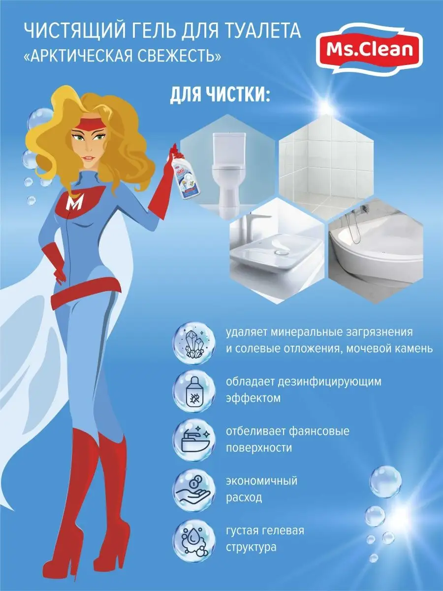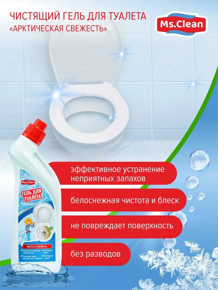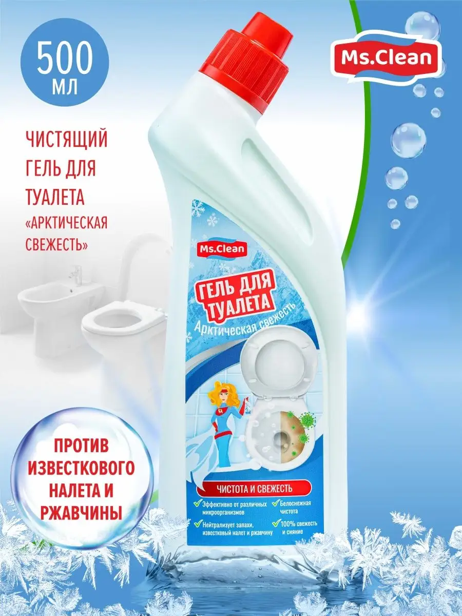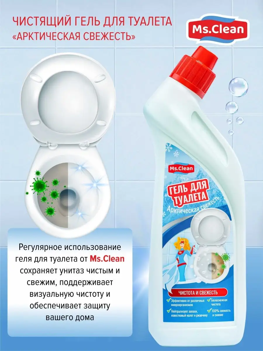 Описание: Универсальный гель для туалета унитаза чистки сантехники Арктическая свежесть от Ms.Clean удаляет самый жесткий известковый налет и ржавчину, минеральные загрязнения и солевые отложения, мочевой камень, потеков ржавчины. Применяется для чистки ванной, кухни, туалета фаянсовых изделий, кафеля, биде, писсуаров и всех видов кафельных и мозаичных поверхностей. Аромат свежести способствует устранению неприятного запаха. Используется также в профессиональной деятельности на предприятиях, производствах. Чистящее средство для унитаза создает умеренную пену которая покрывает слой воды в унитазе, обладает дезинфицирующим эффектом обеспечивает гигиеническую чистоту и защиту от бактерий. Эффективно от 99,9% микробов, гель отбеливает фаянсовые поверхности, приобретает кипельно белый цвет. Благодаря гелевой текстуре он расходуется намного дольше чем другие средства. Благодаря туалетному ершику или губке он справится с устранением микробов, соляных отложений с поверхностей. Миссис клин помощник для ежедневной уборки дома в повседневной жизни. Бытовая химия для уборки дома поможет поддержать ежедневную чистоту без лишних усилий. ms clean российское производство бытовой химии чистящие средства, хозяйственные товары для уборки в нашей линейке представлены целый набор средств, все для уборки дома и дачи. Также можете приобрести средства и в канистре 5 л. акции и скидки на продукты. Приобретая чистящие и моющие средства от Миссис Клин, подарите себе уют и комфорт в доме.