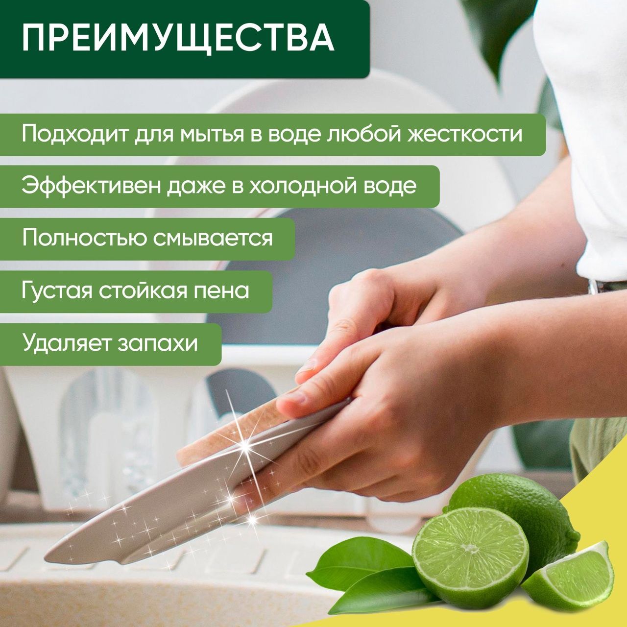 • Благодаря обезжиривающим свойствам средство легко расщепляет жир даже в холодной воде.