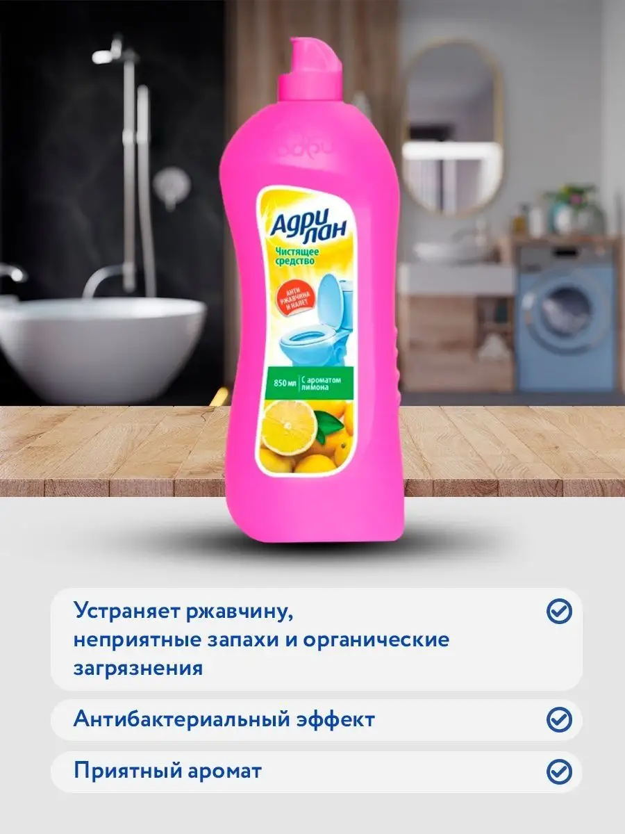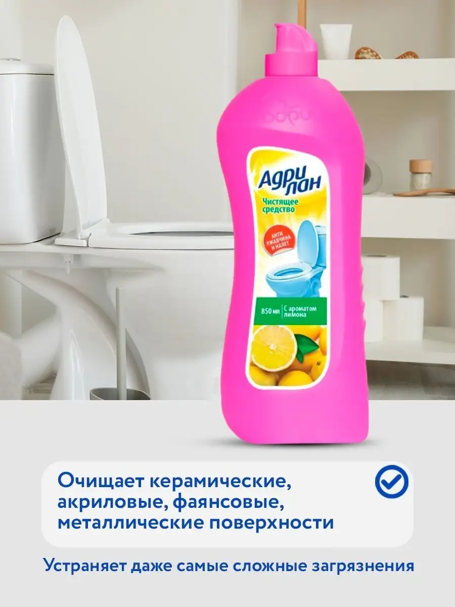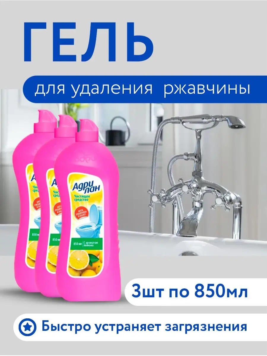 Описание: Средство для сантехники Адрилан комплект 3шт по 0,85 л. Гель для сантехники Адриа Адрилан 850 мл. Лимонный аромат. Назначение: средство для быстрого и эффективного очищения от загрязнений и ржавчины. Дезинфицирует. Подходит для: любой сантехники из фаянса, ванн покрытых кислостойкой эмалью, и пр. хромированных, медных, латунных и нержавеющих покрытий. Способ применения : Перед использованием рекомендуется встряхнуть флакон. Равномерно нанесите средство на очищаемую поверхность с помощью влажной губки или щетки с коротким ворсом, оставьте на 5 минут (для сильных загрязнений увеличьте время воздействия до 15 минут), потом тщательно удалите загрязнения и смойте водой. Не рекомендуется применять на не кислотостойких поверхностях (эмаль, мрамор, глазурь и т.д.)!Меры предосторожности При работе со средством обязательно использование перчаток! Избегать попадания на кожу и в глаза! Состав: 5-15% анионные ПАВ, 5-15% фруктовые кислоты, Средство для сантехники комплект 3шт по 850 мл.