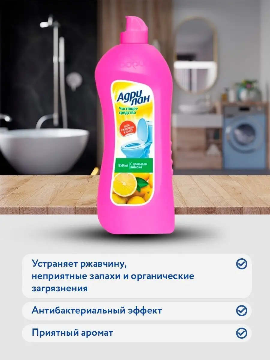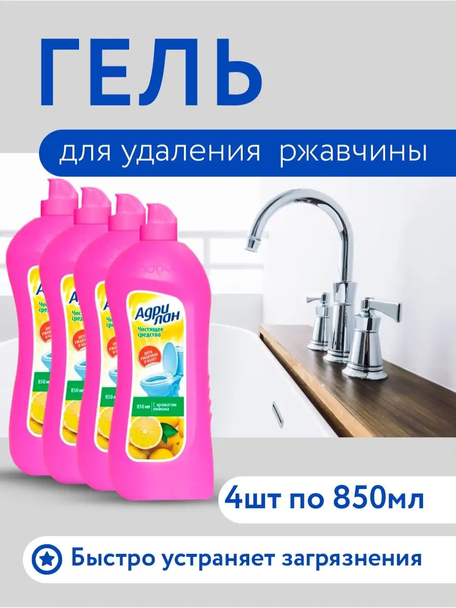 Описание: Средство для сантехники Адрилан комплект 4шт по 0,85 л. Гель для сантехники Адриа Адрилан 850 мл. Лимонный аромат. Назначение: средство для быстрого и эффективного очищения от загрязнений и ржавчины. Дезинфицирует. Подходит для: любой сантехники из фаянса, ванн покрытых кислостойкой эмалью, и пр. хромированных, медных, латунных и нержавеющих покрытий. Способ применения : Перед использованием рекомендуется встряхнуть флакон. Равномерно нанесите средство на очищаемую поверхность с помощью влажной губки или щетки с коротким ворсом, оставьте на 5 минут (для сильных загрязнений увеличьте время воздействия до 15 минут), потом тщательно удалите загрязнения и смойте водой. Не рекомендуется применять на не кислотостойких поверхностях (эмаль, мрамор, глазурь и т.д.)!Меры предосторожности При работе со средством обязательно использование перчаток! Избегать попадания на кожу и в глаза! Состав: 5-15% анионные ПАВ, 5-15% фруктовые кислоты, Средство для сантехники комплект 4шт по 850 мл.