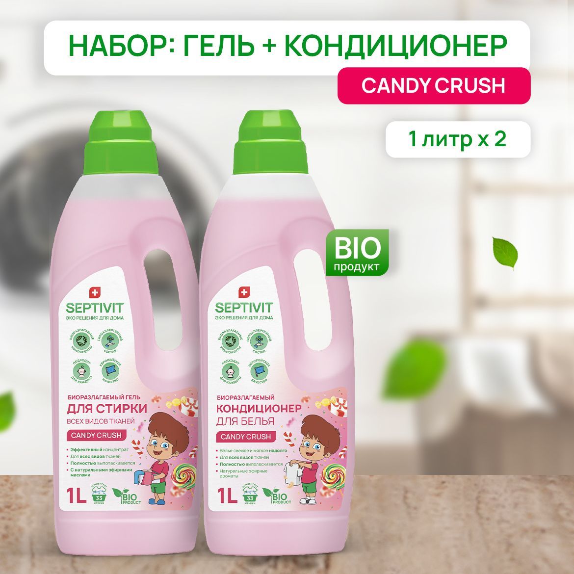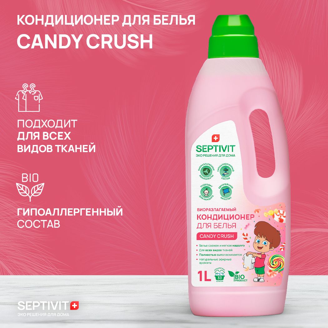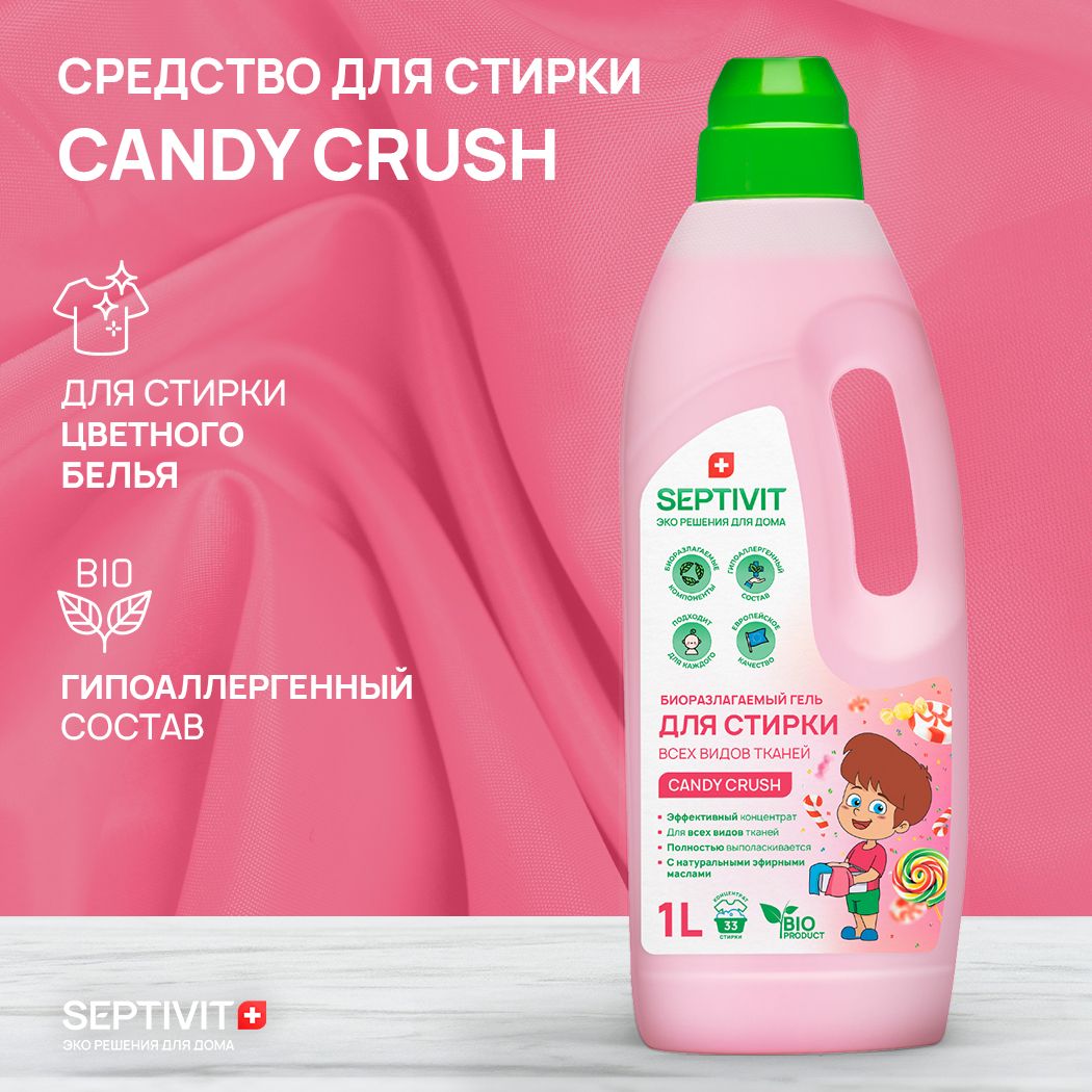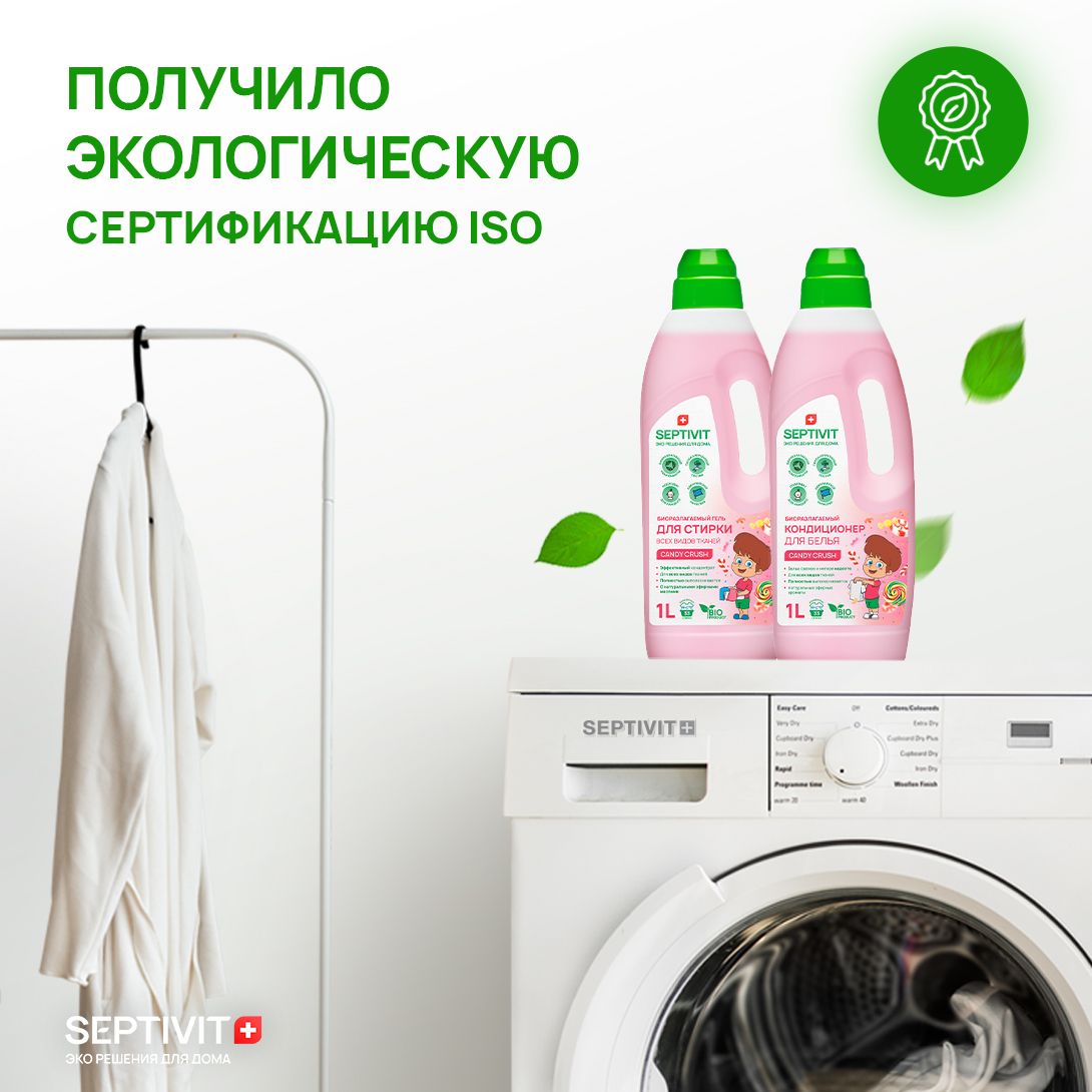 Гель для стирки белья 1 л "Candy Crush" для всех видов тканей и кондиционер 1 л "Candy Crush" Набор SEPTIVIT Premium. Гипоаллергенный, биоразлагаемый