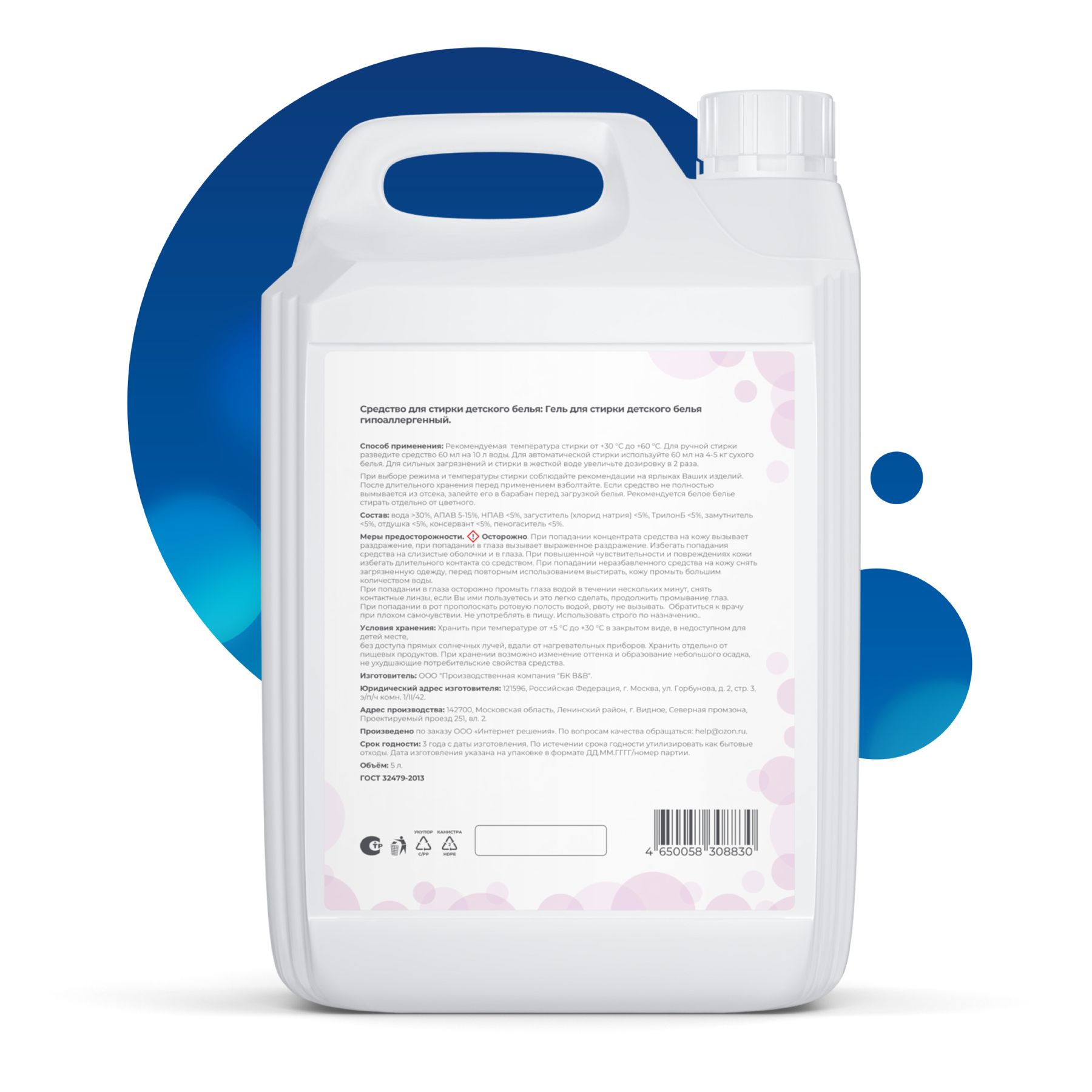 Состав: вода >30%, АПАВ 5-15%, НПАВ <5%, загуститель (хлорид натрия) <5%, трилон Б <5%, замутнитель <5%, отдушка <5%, консервант <5%, пеногаситель <5%.