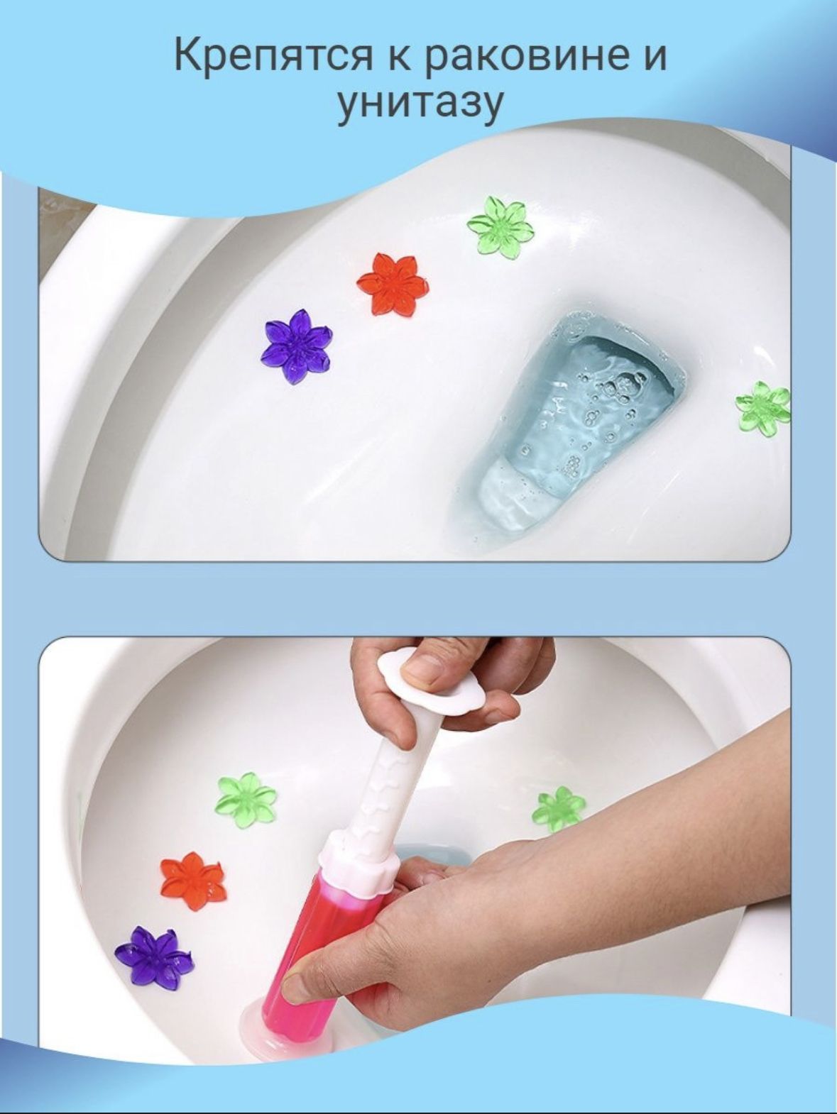 Гель для унитаза в шприце, стикеры, таблетки, очиститель