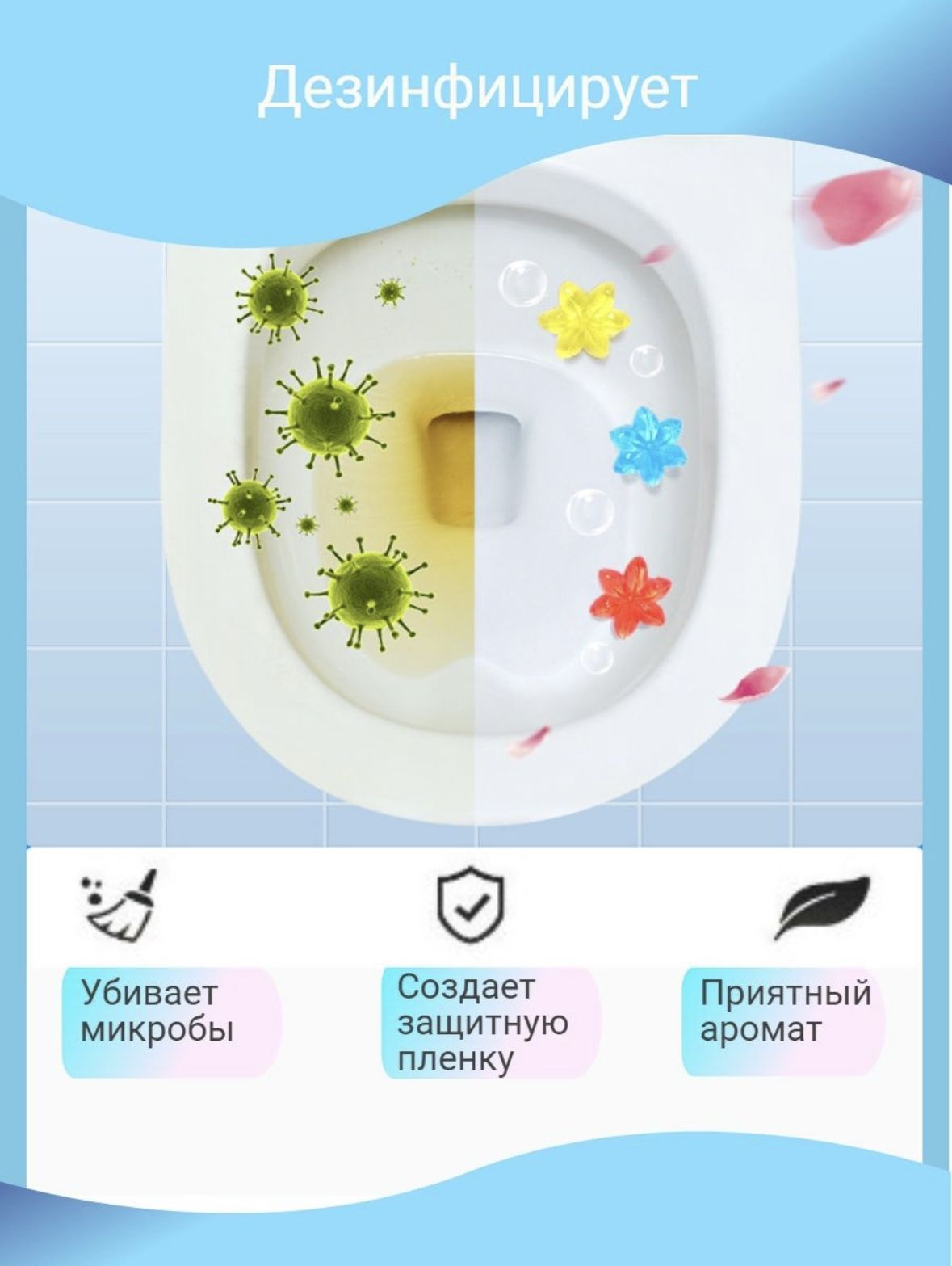 Описание: Ароматизированные стикеры очистители для унитаза с дозатором геля наполнят туалетную комнату превосходным, неповторимым запахом! Натуральные эфирные масла создают приятный свежий аромат. В комплекте есть специальный туалетный блок, с помощью которого удобно наносить диски «чистоты» на унитаз. Гель-дозатор имеет удобный поршень для выдавливания 12 маленьких цветочков очистителя . Такие таблетки для унитаза – самое удобное средство для минимальной чистки от бактерий и ароматизации туалетной комнаты. Компоненты в составе геля не дадут прилипнуть грязи, предотвращают образование желтого налета, стерилизуют поверхность. Как и многие средства для унитаза, содержащие очиститель, эти стики дезинфицируют поверхность, поддерживают чистоту, приятный аромат и свежесть унитаза. Таблетки и туалетные блоки с креплениями не всегда удобно использовать и крепить. Дозатор с гелем удобен, практичен и не требует дальнейших прикосновений после приклеивания. Отсутствие корпуса не дает скапливаться бактериям. Эффективное использование до 7 недель. Экономичный: хватает до 720 смываний. Соберите дозатор по инструкции и прижмите к сухой поверхности унитаза, нажмите и удерживайте кнопку, пока она не щелкнет. Под ободком появится гелевый диск. Спустите воду, чтобы активировать диск. Для усиления аромата выдавите несколько цветков с гелем.