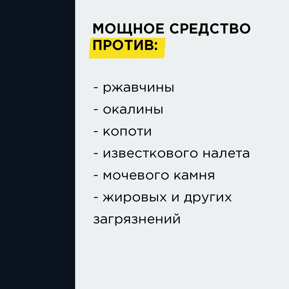Сильнокислотный низкопенный готовый к применению препарат, полупрозрачный оранжевого цвета с ароматом морской свежести, против ржавчины, окалины, копоти, серы, известкового налёта, водного, мочевого и котлового камня, цемента и растворов на его основе, строительных замазок, жировых и др. загрязнений на кафеле и др. керамике, нержавеющей стали, стёклах и др. кислотостойких поверхностях. Обладает бактерицидными свойствами.
