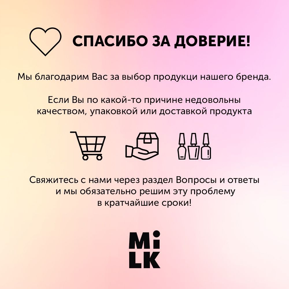 • Для просушки гель-лаков MILK лучше всего использовать LED-лампы мощностью 36-48 Вт.