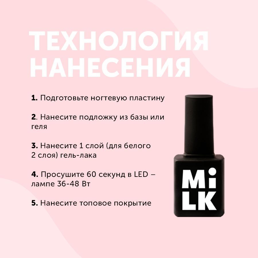 Описание: «Да она модница», — скажут про тебя, когда увидят на твоих ногтях этот насыщенный оттенок сирени. MILK — безопасность. Безопасная 11-free формула наших гель-лаков содержит только качественное сырье и разработана в соответствии с нормативной документацией. Она подходит даже самым чувствительным рукам. MILK — комфорт. Уникальная кремовая формула MILK Cream самостоятельно распределяется по ногтевой пластине и нежно обволакивает ее. MILK — актуальный дизайн. Гель-лаки MILK упакованы в стильные флаконы, которые будут идеально смотреться на твоих полках. MILK — забота. Это первый уходовый бренд гель-лаков, в ассортименте которого представлены йогуртовые средства для кожи рук и ногтей. MILK — высокое качество. Ультрапигментированная формула гель-лаков плотно ложится в один слой и полностью полимеризуется при любой его толщине, а отсутствие запаха делает процесс создания маникюра приятным и комфортным. MILK — доступная цена. Плати только за качество! Мы предлагаем нейл-мастерам безопасный и высокотехнологичный продукт c комфортной стоимостью. Технология нанесения гель-лаков MILK • Для просушки гель-лаков MILK лучше всего использовать LED-лампы мощностью 36-48 Вт. • Наноси гель-лак в два тонких слоя. • Первым слоем выстраивай границы в зоне кутикулы и боковых пазухах. Не просушивая, возьми на кисть небольшую каплю гель-лака и разровняй ее по мокрому слою. Просуши в лампе 30 секунд. • Второй слой наноси тонко. Не нажимай на кисть — она должна двигаться легко, без давления. Объем: 9 мл
