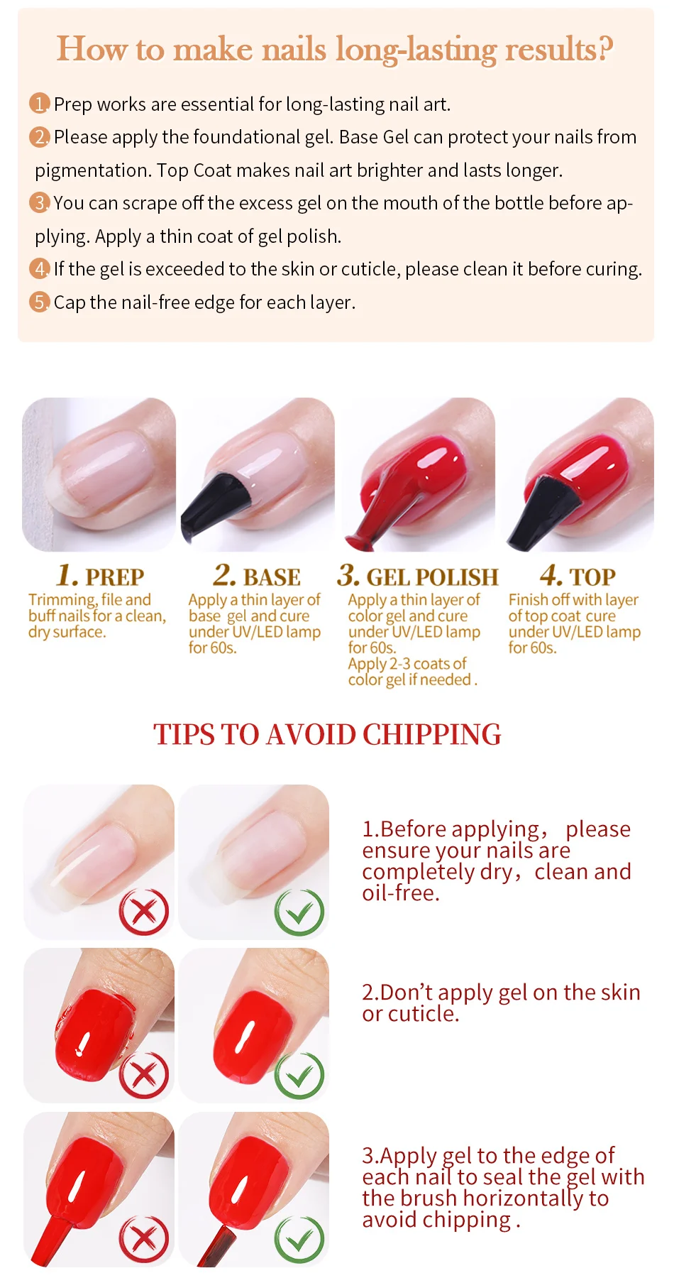 Step 2.    Apply  base gel first,which can make polish lasting longer, cure with UV lamp or LED lamp.           (Necessary)