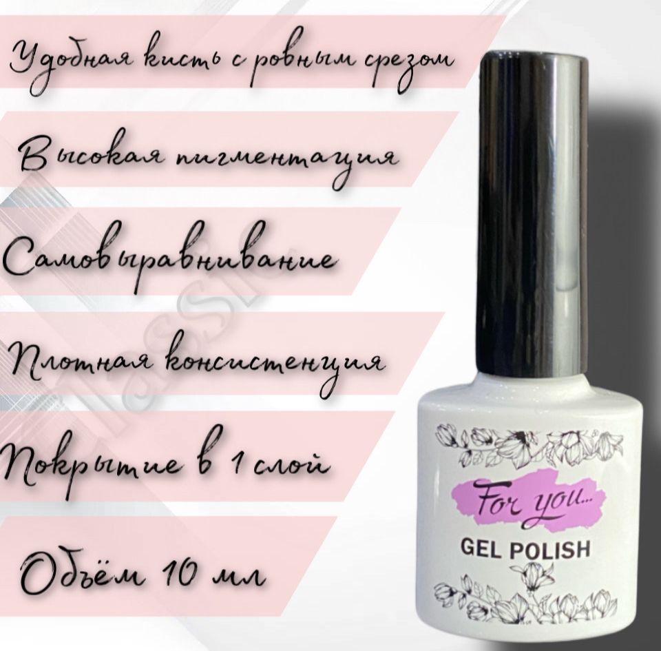 Описание: FOR YOU — это гель-лаковое покрытие нового поколения для тех, кто не стоит на месте, постоянно пробует новое и движется вперед без сомнений!  Идеально сбалансированная формула обеспечивает плотную консистенцию, эффект самовыравнивания, высокую пигментацию, насыщенные цвета, невероятную стойкость и яркий блеск. Легкое нанесение даже в 1-2 слоя при минимальной стоимости покрытия позволяет экономить усилия и время мастера, а также постоянно баловать себя и своих клиентов новыми оттенками!
