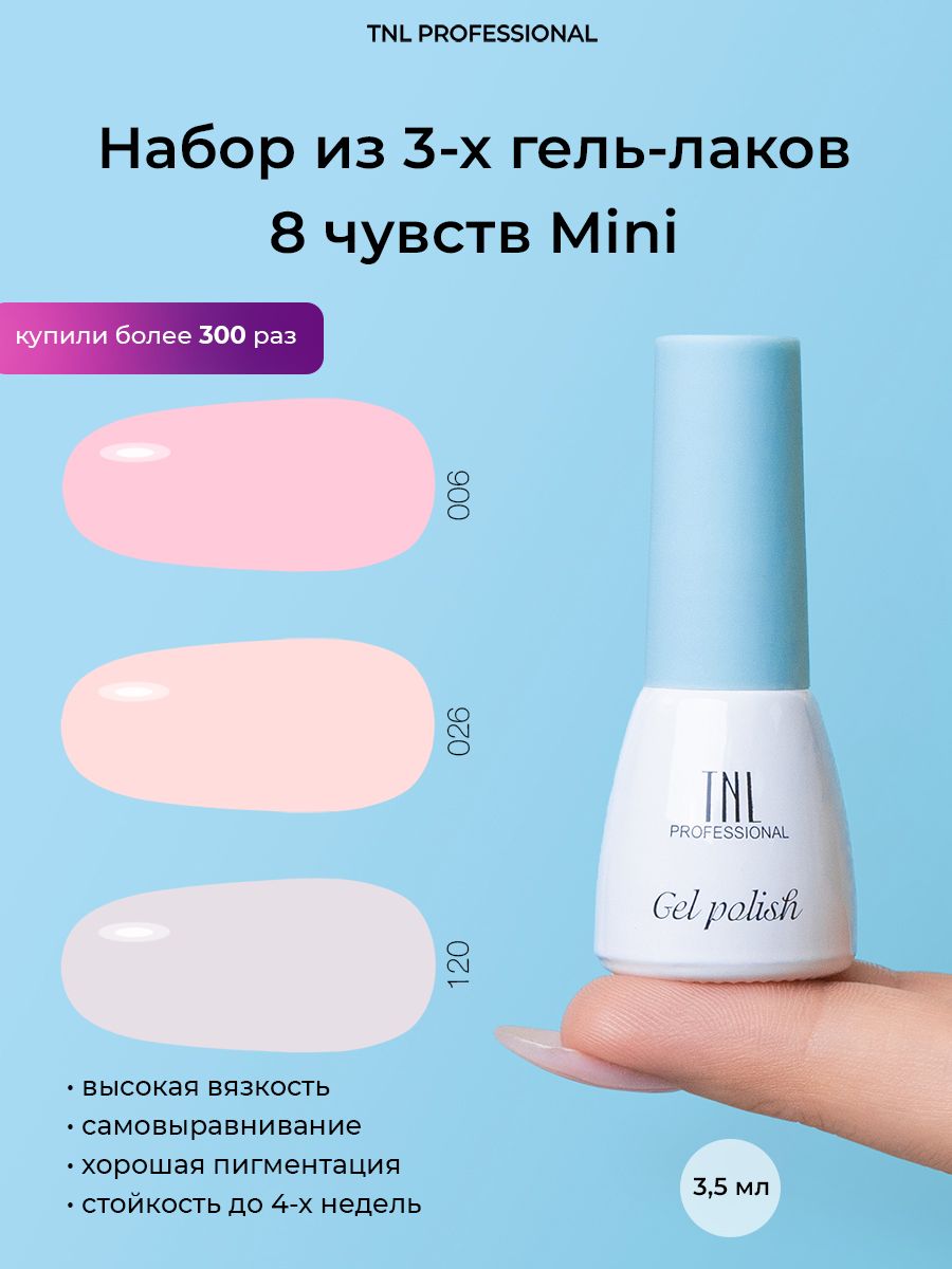 Гель лак для ногтей набор TNL 8 чувств Mini - оттенки 006, 026, 120 (3,5 мл.) натуральный розовый бежевый для маникюра