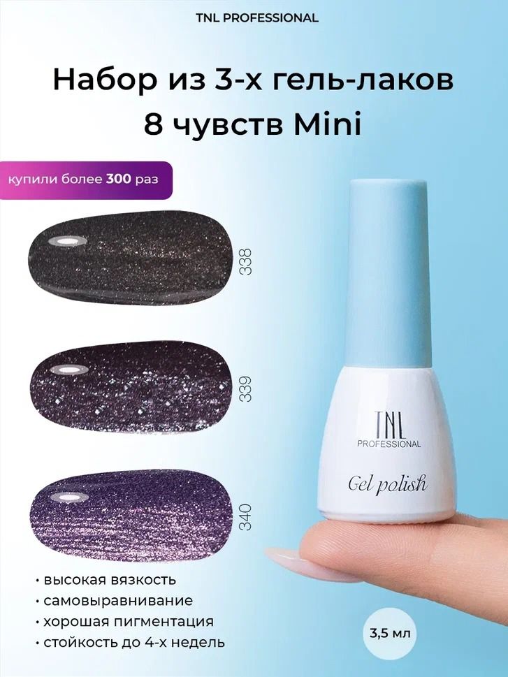 Гель лак для ногтей набор TNL 8 чувств Mini - оттенки 338, 339, 340 (3,5 мл.) с блестками розовый, баклажановый для маникюра
