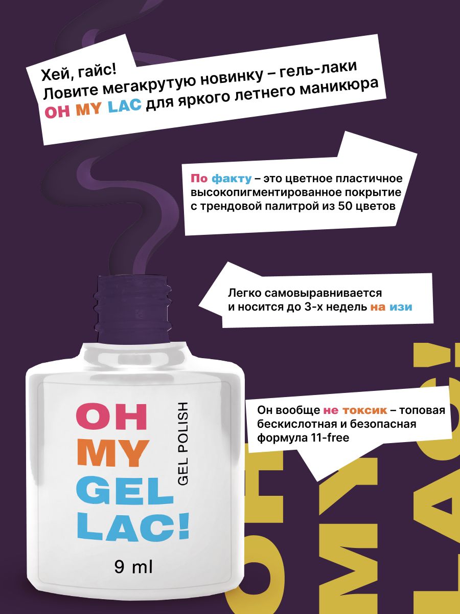 Описание: Хей, гайс! Ловите мегакрутую новинку – гель-лаки OH MY LAC для яркого летнего маникюра 2022. По факту – это цветное пластичное высокопигментированное покрытие с трендовой палитрой из 50 цветов. Гель-лак на коротких ногтях легко самовыравнивается и носится до 3-х недель на изи. Он вообще не токсик – топовая бескислотная, гипоаллергенная и безопасная формула 11-free убережет ноготки от кринжовых компонентов в составе. Гель-лаки изготовлены из сырья высшего качества и made in Russia. Хайли рекоменд для самого безупречного маника форевер.