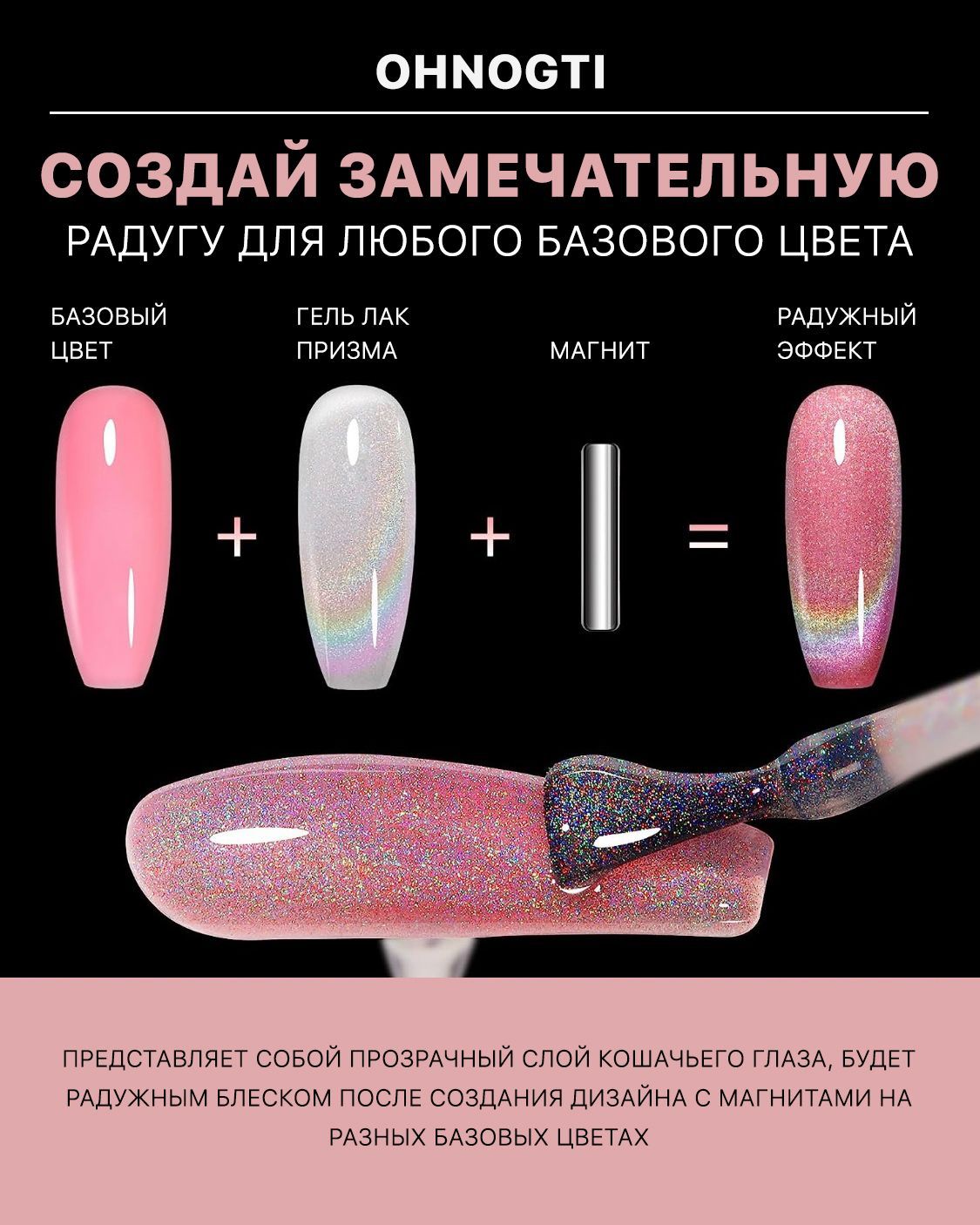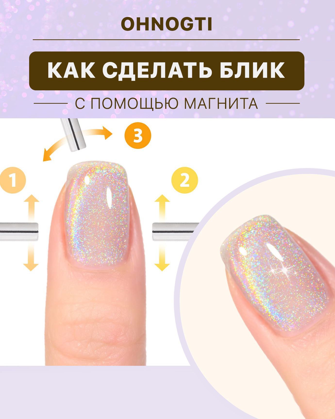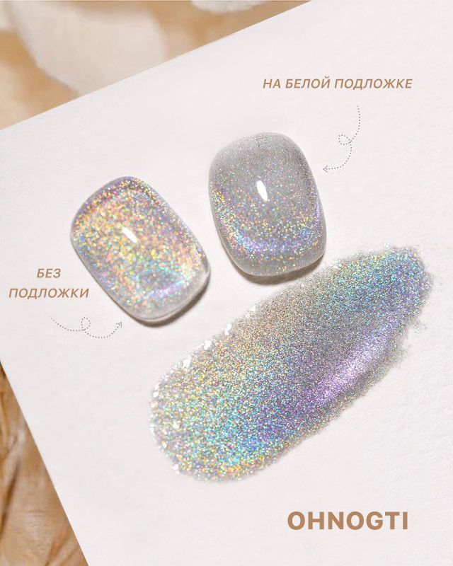 - Большое содержание радужного пигмента💡Совет:-Чем толще вы наносите гель-лак для ногтей, тем более очевидным будет эффект блеска .