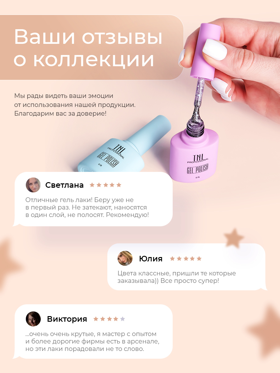 Описание: Коллекция 8 чувств от TNL Professional. В палитре представлено более 350 разнообразных оттенков: серый, черный, белый, желтый, красный, синий, зеленый, бежевый, молочный, бордовый, голубой, розовый, оранжевый, хаки, оливковый. Лак не растекается, не утяжеляет ногти, самовыравнивается, укрепляет ногтевую пластину. Уникальная парфюмерная композиция придает гель-лаку приятный аромат. Срок носки гель-лака - до 4 недель. Линейка получила восторженные отзывы от топовых мастеров. Соберите свою уникальную коллекцию гель-лаков вместе с TNL Professional! *Цвет упаковки определяется случайным образом и не зависит от цвета гель-лака. Шилак или шеллак для ногтей - так гель лаки называли раньше, а сегодня этими технологиями пользуются не только профессионалы, но и все желающие в домашних условиях. Для полимеризации данного гель лака обязательно наличие уф-лампы (UV LED). Для идеального маникюра применяется каучуковая база TNL. В ассортименте TNL есть цвета на любой вкус: гель лаки с блестками, укрепление ногтей, гельлак светоотражающий, камуфлирующий, неоновый, кошачий глаз, блестящий. В процессе нанесения рекомендуем использовать матовый или глянцевый топ от TNL. А если финишное (верхнее) покрытие вы завершите топом поталь серебро или золото от TNL, то получите особенный результат.