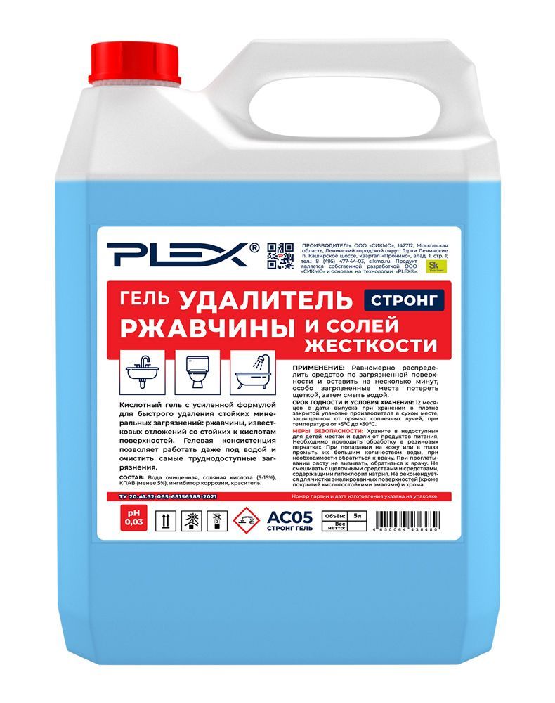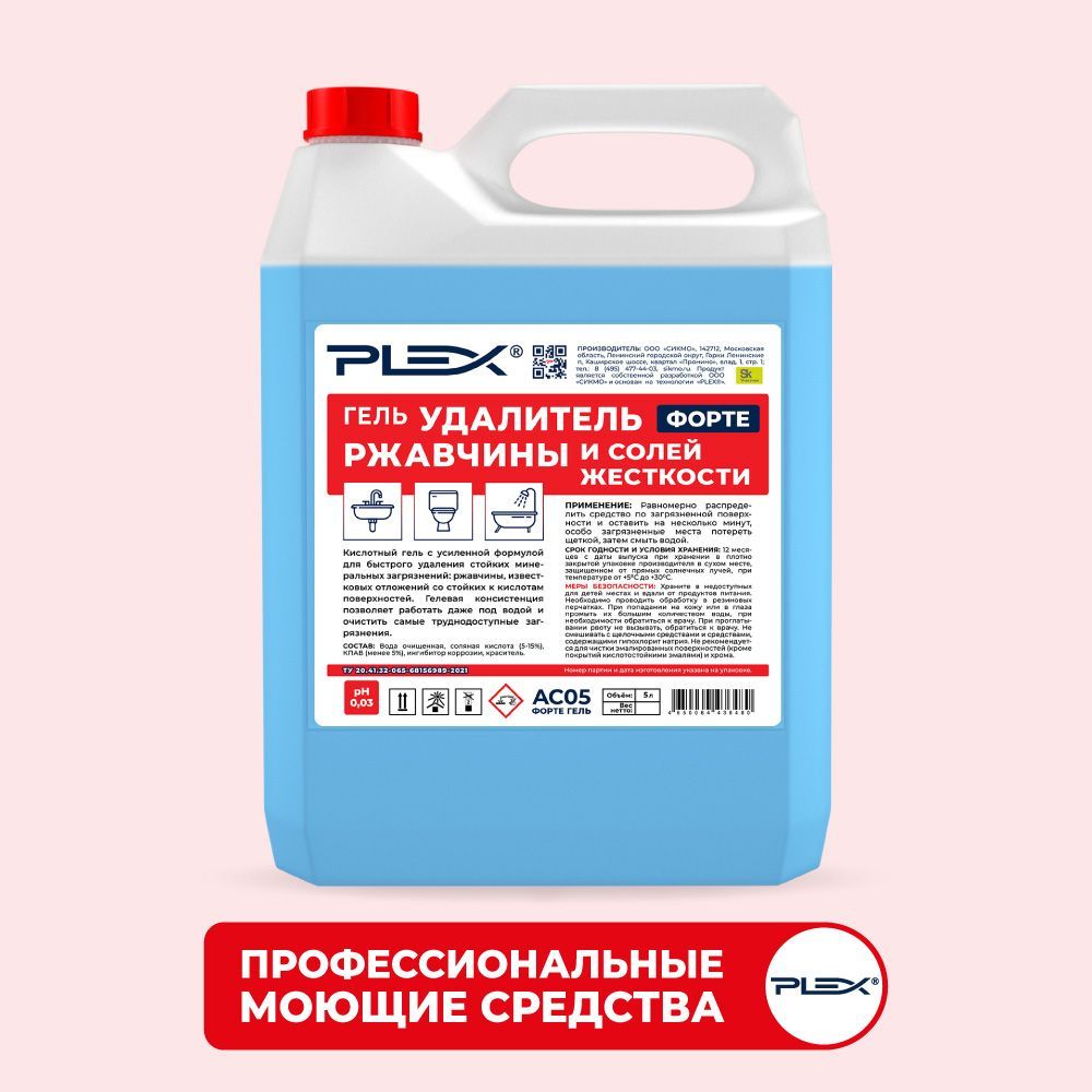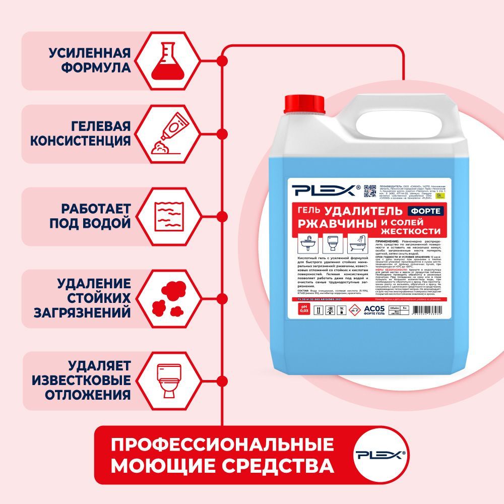 Описание: ПРОФЕССИОНАЛЬНЫЕ МОЮЩИЕ СРЕДСТВА PLEXВ водопроводной воде содержится железо, которое приводит к образованию ржавчины, ухудшает качество воды, образует ржавый осадок на сантехнике и емкостях. PLEX производит профессиональные моющие средства от ржавчины и известкового налета, которые легко справляются со стойкими и даже застарелыми пятнами. Компания производитель бренда PLEX гарантирует высокое качество продукции, широкий ассортимент, эффективность и безопасность препаратов для очистки и удаления любых загрязнений.Высокоэффективное средствоЧистящий гель PLEX с ингибиторами коррозии и бактерицидным действием быстро справляется с очисткой поверхностей от ржавчины и известкового налета. Биоразлагаем, безопасен и эффективен, полностью смывается водой, безопасен для септических установок. Не содержит: хлор, фосфаты, оптические отбеливатели. Универсальный гель для сантехникиГель от известкового налета и ржавчины PLEX – универсальное чистящее средство для ежедневной уборки поверхностей, устойчивых к кислотам, в ванных комнатах и санузлах. Гель PLEX устраняет известковый налёт, ржавчину, камень и минеральные загрязнения даже в холодной и жесткой воде, обладает антибактериальным эффектом, устраняет неприятные запахи. Средство для сантехники, средство для ванной комнаты, для ванны, средство для санузла, средство для раковины, душевой кабины .ГЕЛЬ ОТ ИЗВЕСТКОВОГО НАЛЕТА И РЖАВЧИНЫ ДЛЯ САНТЕХНИКИ, ТУАЛЕТОВ И ВАНН PLEXГель для удаления известкового налета и ржавчины PLEX с усиленной формулой для быстрого удаления стойких минеральных загрязнений: ржавчины, известковых отложений со стойких к кислотам поверхностей. Гелевая консистенция позволяет работать даже под водой и очистить самые труднодоступные загрязнения.