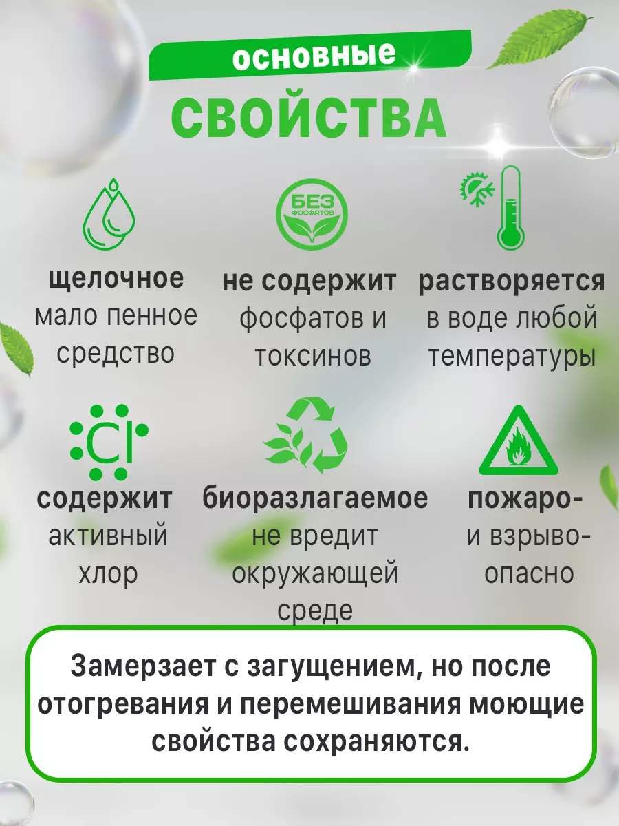 Описание: Щелочное универсальное моющее средство с гипохлоритом натрия. Средство используется для отбеливания белья, а также очистки и дезинфекции посуды, кафеля, фаянса, ванной комнаты, кухни, полов. Отличается сильным отбеливающим и дезинфицирующим действием.Удаляет неприятные запахи, убивает микробы и бактерии, грибок и мох.Рекомендовано для использования в медицинских, детских учреждениях, на предприятиях пищевой промышленности, (молочной, мясной, рыбоперерабатывающей и т.д.), общественного питания и в быту.Жидкий щелочной мало пенный концентрат с активным хлором. С хорошим обезжиривающим и дезинфицирующим действием. Полностью растворяется в воде любой жёсткости и температуры. Эффективно против органических, жировых, белковых загрязнений, плесени, слизи и мха, пятен от кофе и чая, крови и зелени на полимерных покрытиях, кафеле и др. керамике, стёклах, пластмассах, мармолеуме и линолеуме, тераццо, натуральном и искусственном камне, бетоне, нержавеющей стали, дереве и др. поверхностях. Удаляет пятна на белье, убивает бактерии неприятного запаха. Экологически безопасно. Белизна 3 в 1 от Белославы идеально подойдёт для уборки дома. Средство белизна это профессиональный отбеливатель для белья и одежды. Чистящее средство подходит для туалета и ванной. Чистящий и мощный отбеливающий пятновыводитель для белья эффективен против пятен и удаления грязи. Благодаря этому средству для дома раковина и сантехника быстро избавятся от известкового налета и очистки плесени. Дезинфекция и антисептический эффект после чистки ванн и душа обеспечен. Также моющие средства можно безопасно применять для дома и кухни. Канистра 5 литров очень удобна в хозяйстве и её объёма хватит надолго. Дезинфицирующее средство для мытья пола безопасно под линолеум и ламинат комнаты, уничтожит все бактерии. Подойдёт для прочистки труб и против ржавчины для унитаза. Хлорка и очиститель всегда будут эффективны. ВАЖНО! В зависимости от партии и остатков на складе средство может приходить в разных канистрах.