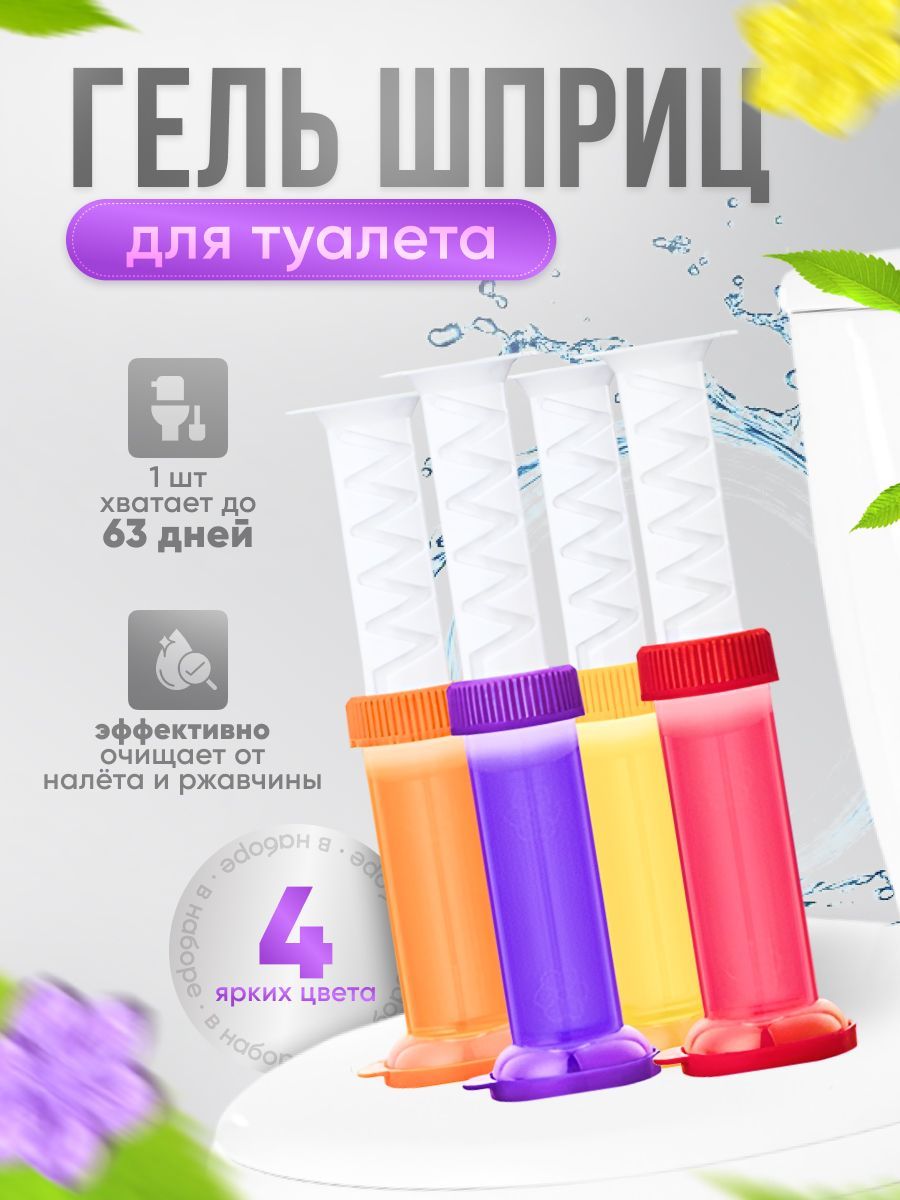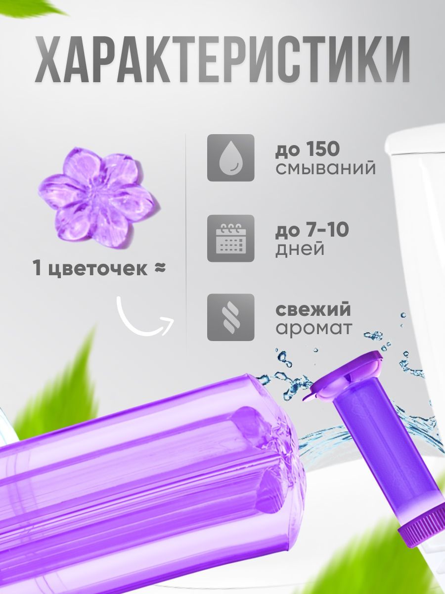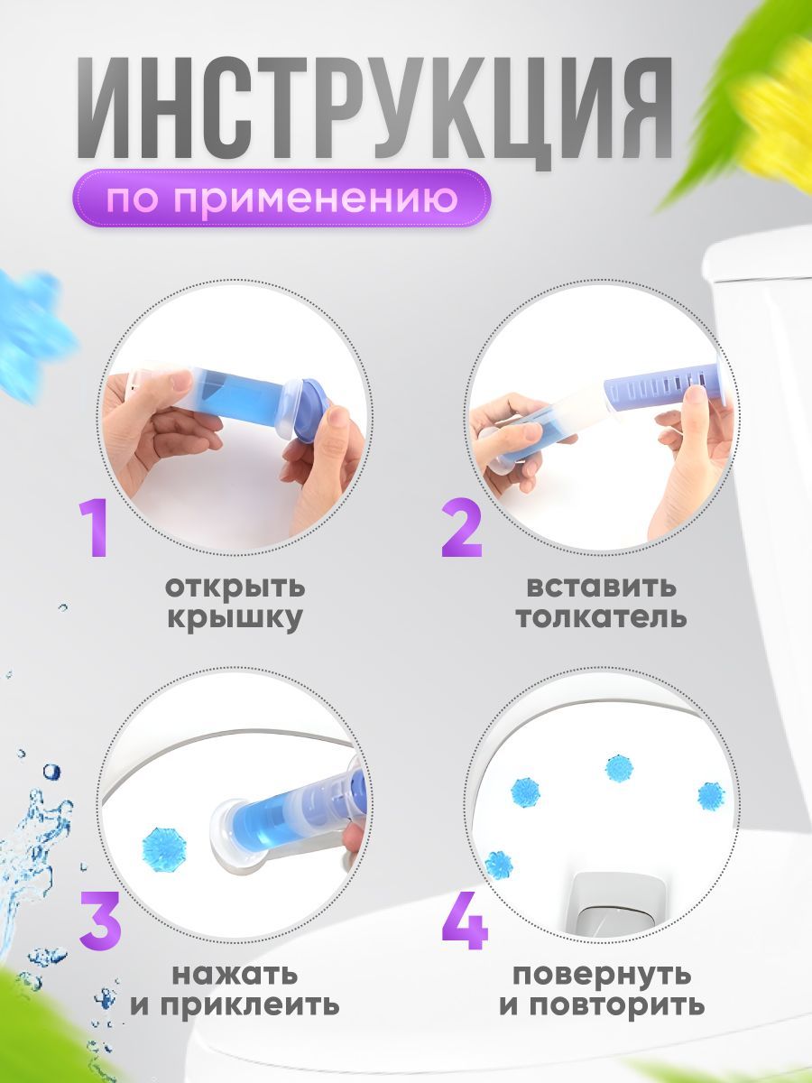 Описание: Средство по уходу за туалетом борется с очагами скопления микробов, освежитель для туалета поддерживает чистоту и свежесть, защищает от известкового налета. Не нужно прикасаться к грязным блокам унитаза. Отсутствие корпуса не дает скапливаться бактериям. Эффективное использование до 7 недель. Обеспечивает чистоту и приятный аромат при каждом смывании. Экономичный: хватает до 720 смываний. Таблетки для унитаза можно приклеить 11 маленьких или 6 больших цветков. Гелевый очиститель унитаза в удобном дозаторе. Соберите дозатор по инструкции и прижмите к унитазу, нажмите и удерживайте кнопку, пока она не щелкнет. Под ободком появится гелевый диск. Спустите воду, чтобы активировать диск. Для более мощного эффекта используйте сразу несколько гелевых дисков для унитаза. Так же можно создать неповторимый запах используя сразу несколько ароматов геля. При каждом смывании средство будет заботиться о чистоте туалета и распространять приятный аромат. Диски для унитаза как туалетный утенок. Когда диски закончатся, поверните сменный блок, удерживая кнопку, и извлеките его из ручки. Сохраните ручку для использования со сменными блоками.