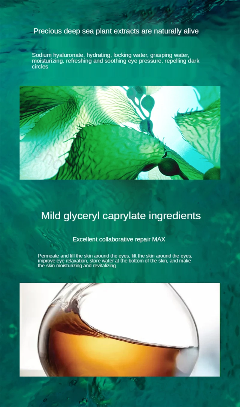 Богатые минералами и витаминами глубоководные морские водоросли насыщают кожу питательными веществами, помогают борется с возрастными переменами, стимулируют производство коллагена, необходимого для молодости кожи. Гиалуроновая кислота обеспечивает интенсивное увлажнение, защищает кожу от обезвоживания и появления шелушения, уменьшает отрицательное воздействие внешних факторов, повышает эластичность кожи. NIAC нормирует обменные процессы, помогает уменьшить круги под глазами.