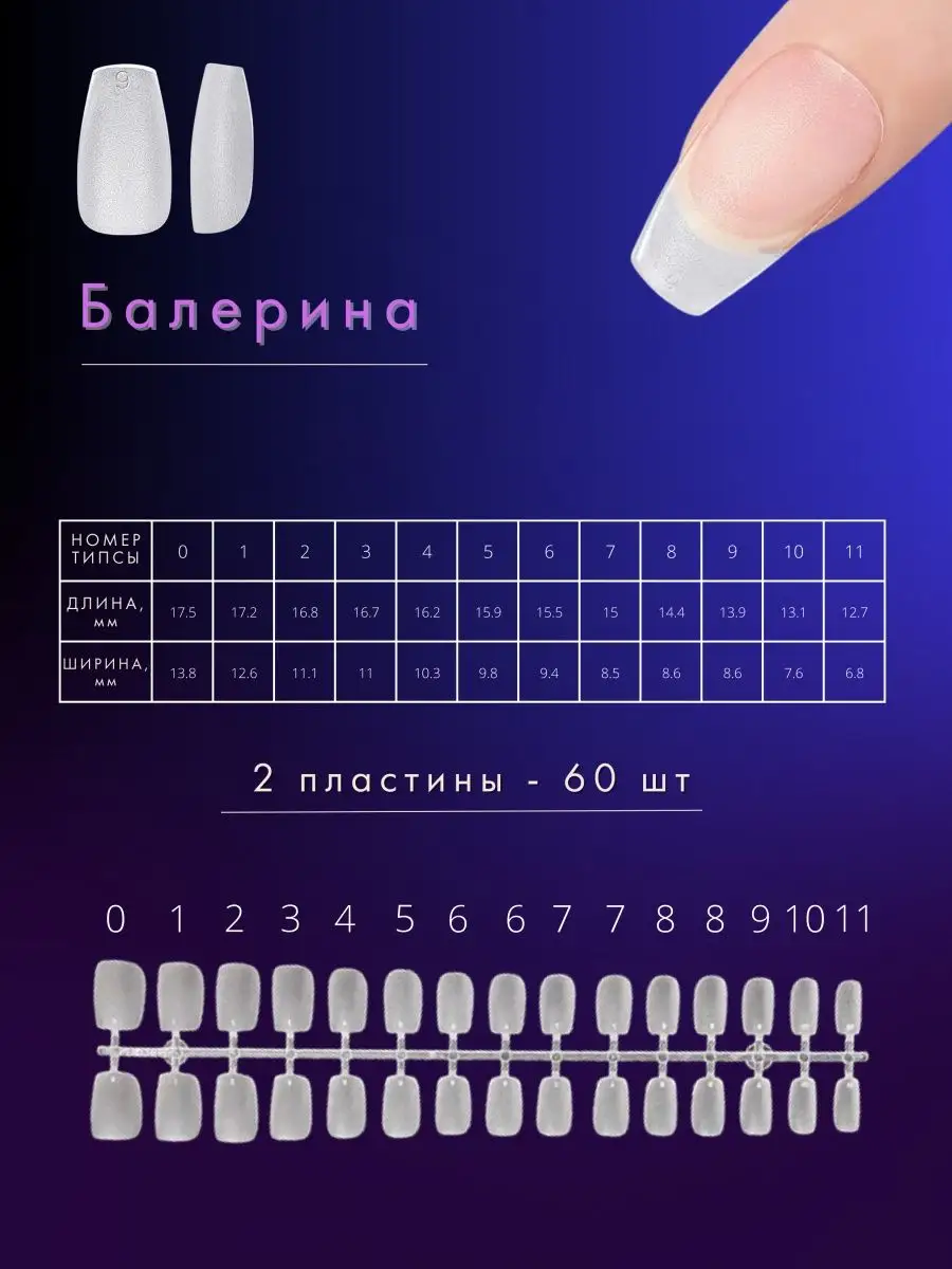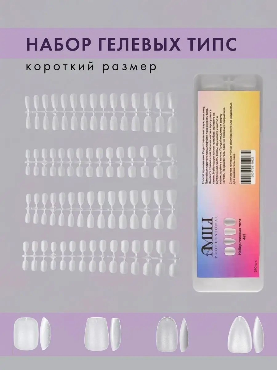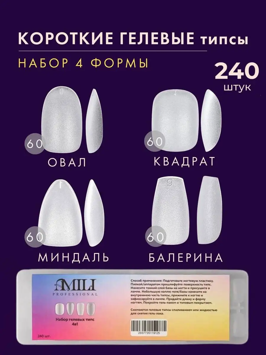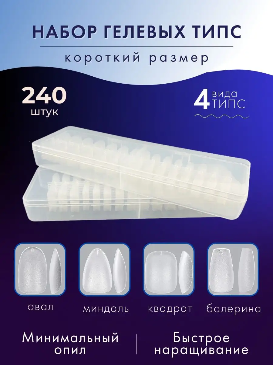 Комплектация Гелевые типсы квадрат 60 штук; Гелевые типсы овал 60 штук; Гелевые типсы миндаль 60 штук; Гелевые типсы балерина 60 штук