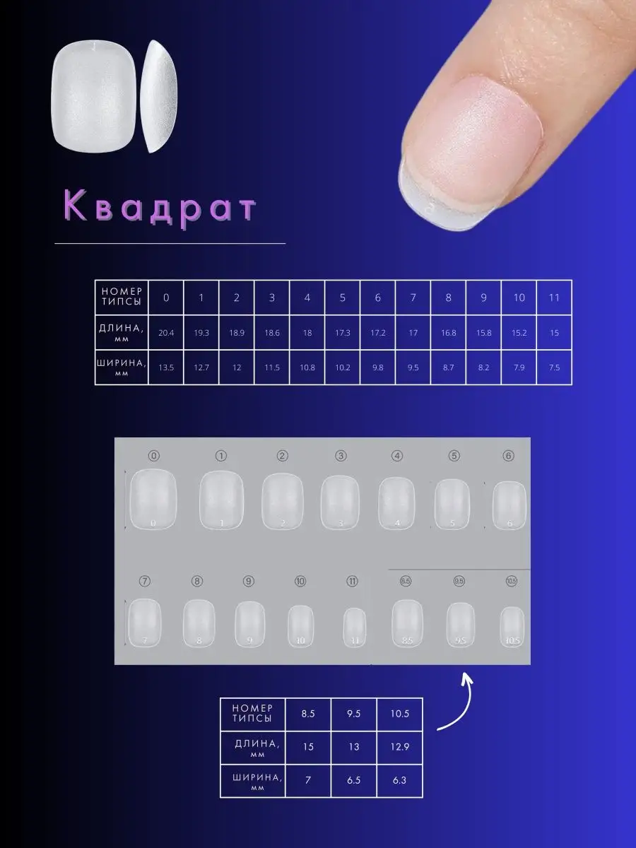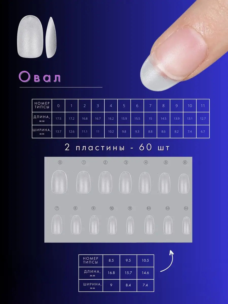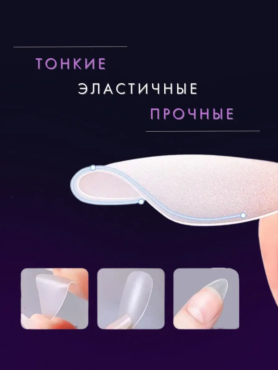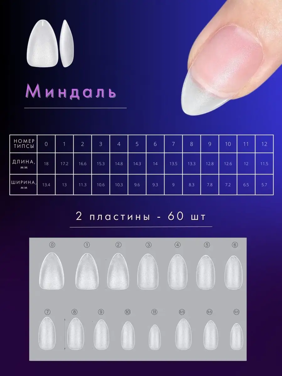 Комплектация Гелевые типсы квадрат 60 штук; Гелевые типсы овал 60 штук; Гелевые типсы миндаль 60 штук; Гелевые типсы балерина 60 штук
