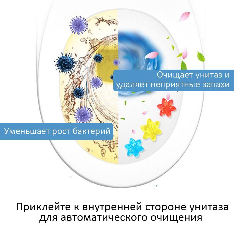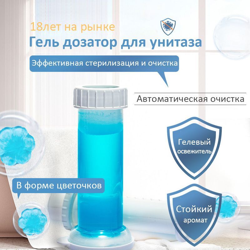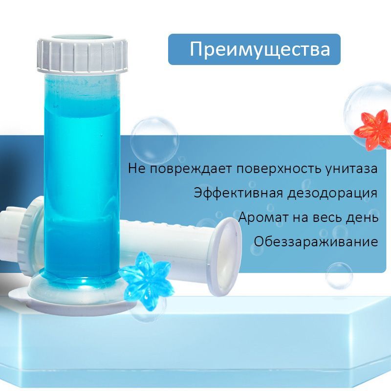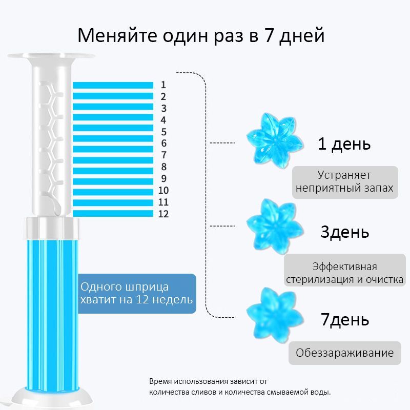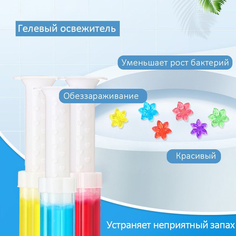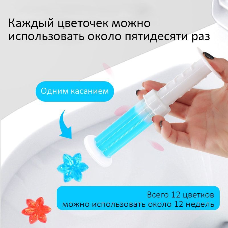 Описание: Гелевый освежитель для унитаза представляют собой новый формат средства, которое помогает поддерживать чистоту и приятный запах в туалетной комнате. Эти гелевые блоки располагаются под ободком унитаза и предотвращают загрязнения, а также нейтрализуют неприятные запахи. Они имеют нежный и ненавязчивый аромат, придавая свежесть вашему туалету. Гель для туалета 3 в 1 (шприц для туалета) является прекрасным средством для чистки унитаза с различными ароматами. В шприце содержится 11 дисков, и одного диска хватает на примерно 50 смываний, примерно неделю использования. Вода, омывая гелевые цветочки, соединяется с активными компонентами геля, что обеспечивает качественный гигиенический эффект на внутренней поверхности унитаза, придавая ему приятный аромат. Чтобы добиться длительного результата, гелевый очиститель для унитаза следует установить на ободок таким образом, чтобы при смыве воды он полностью омывался.