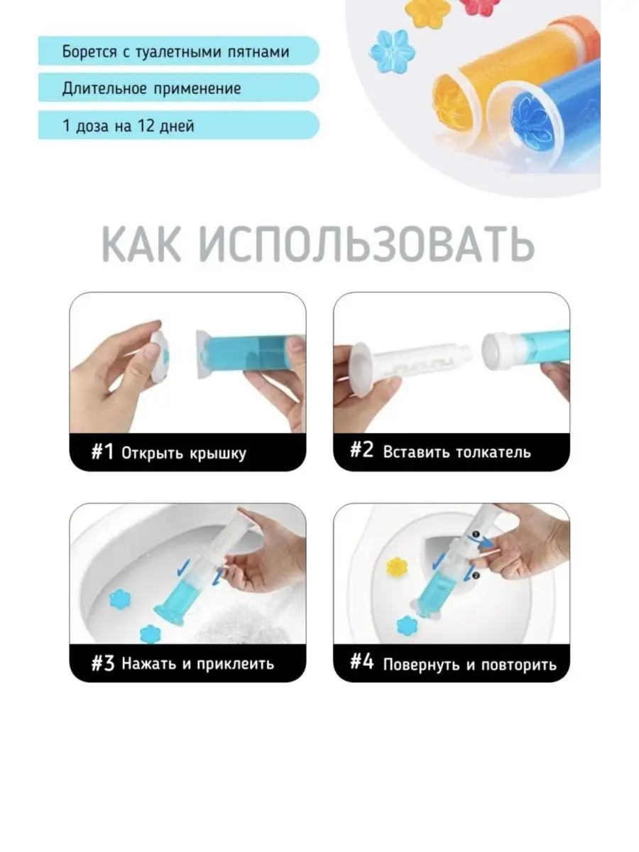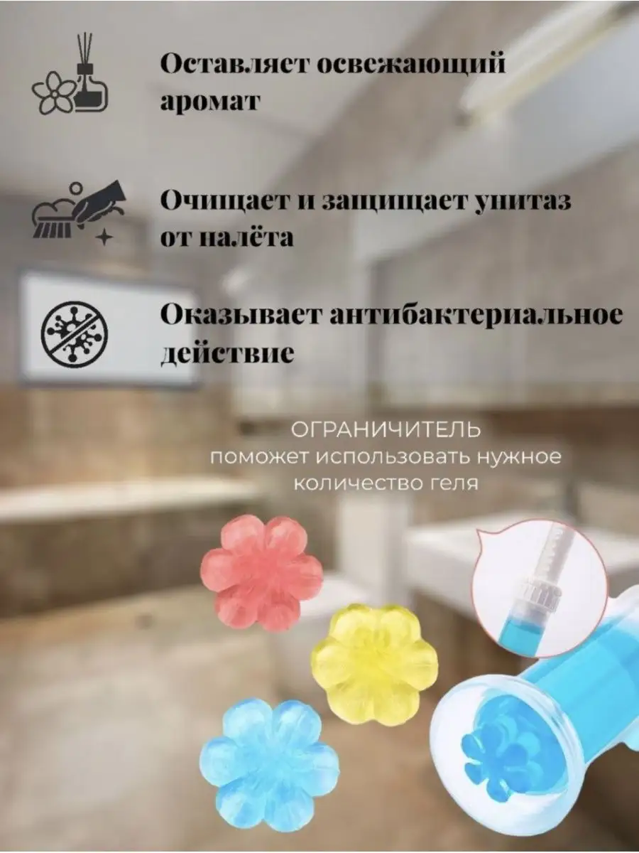 Описание: Гелевый дозатор для унитаза для очистки поверхности унитаза, поддержания чистоты и приятного аромата в туалетной комнате. Средство для унитаза эффективно борется с микробами, помогает справиться с ржавчиной и налетом. Гелевый освежитель рассчитан на 15 применений. Дозатора хватит на 1500 смываний. Гелевый освежитель для унитаза с дозатором обеспечивает дешевую уборку туалета. Гель-дозатор для очистки унитаза с ароматами морской свежести и лимона! Гелевые диски в форме цветков для унитаза – это новое современное средство для ухода и поддержки чистоты в туалетной комнате. Гелевый дозатор для унитаза эффективно убивает микробов и препятствует их размножению, удаляет и предотвращает образование желтого известкового налёта, наполняет туалет легким, приятным и естественным ароматом. Использование сменного гель стикера чистоты - максимально гигиенично, вы не прикасаетесь руками к поверхности унитаза, это очень удобно, особенно в сравнении с подвесным блоком для унитаза. Дозатор для унитаза - незаменимый хозяйственный товар для дома и настоящей хозяйки.