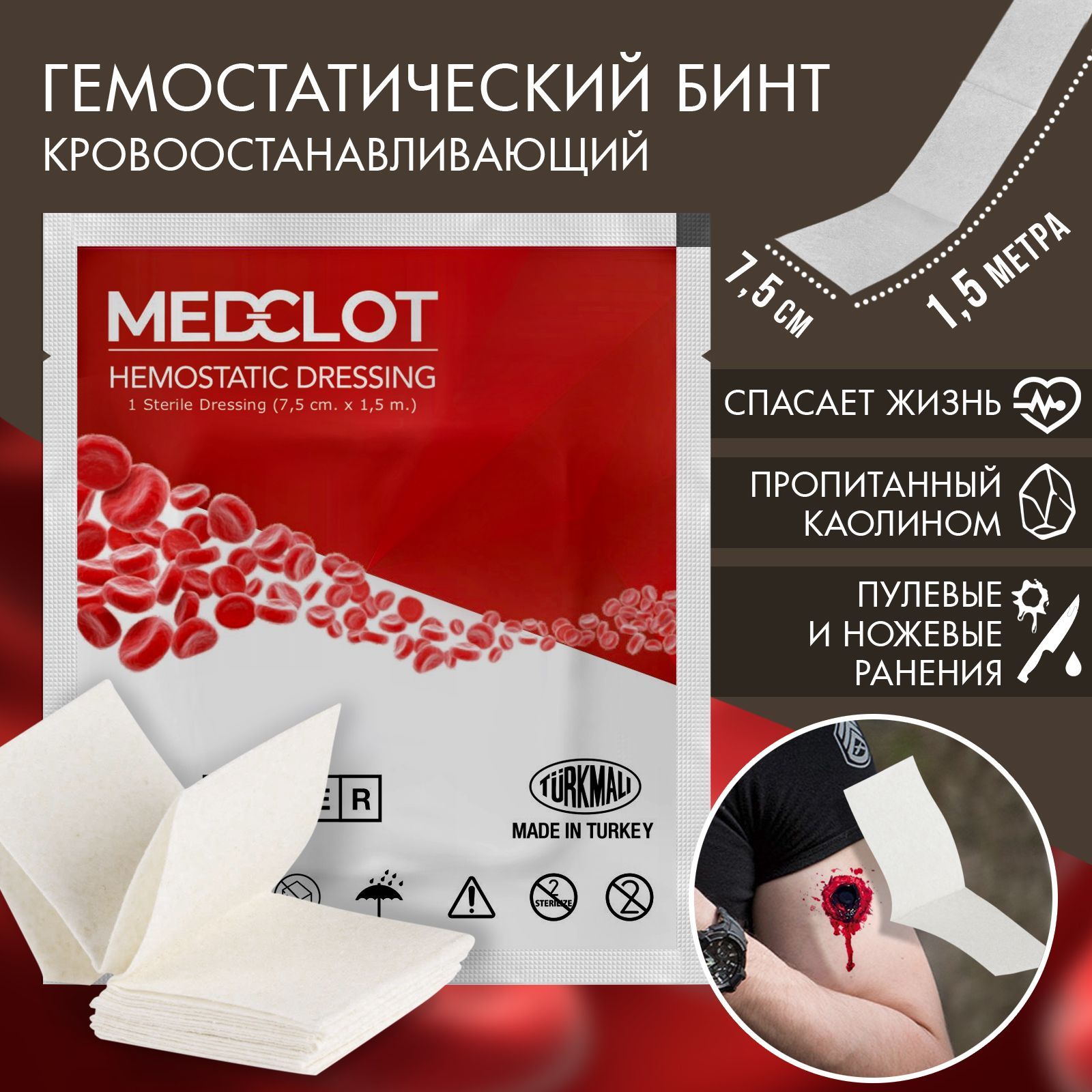 Описание: Гемостатический бинт MEDCLOT по типу Celox Gauze Z-Fold и Quik Clot combat gauze. (7,5 см х 1,5 м). Официальный гемостатик вооруженных сил Турции. - это современный кровоостанавливающий тактический бинт, сложенный Z "гармошкой" в герметичной стерильной упаковке. Такой вариант гораздо эффективнее по сравнению с рулонно упакованными бинтами или порошком россыпью. Особенно в ветреную и мокрую погоду, при стрессе или при сильной усталости (трясутся руки) т.к. позволяет намного быстрее наложить его на зону ранения или тампонировать проникающие ранения, не тратя время на разматывание. Сразу после наложения бинта на рану необходимо сильно давить не менее 3 минут для создания поверхностного давления и начала его действия.Бинт полностью покрыт кровоостанавливающим раствором гемостатических гранул, позволяет накладывать на рану сегмент за сегментом прямо из упаковки. В отличие от других широко используемых гемостатических средств, Medclot не содержит белков животного или человеческого происхождения, которые могут вызывать аллергические реакции. Активными ингредиентами гемостатической марли Medclot последнего поколения являются ткань, пропитанная каолином и карбоксиметилцеллюлозой натрия.Компактный размер упаковки позволяет переносить MEDCLOT в любом кармане полевой униформы или в любом удобном подсумке. Инструкция по применению нанесена на обратной стороне упаковки.