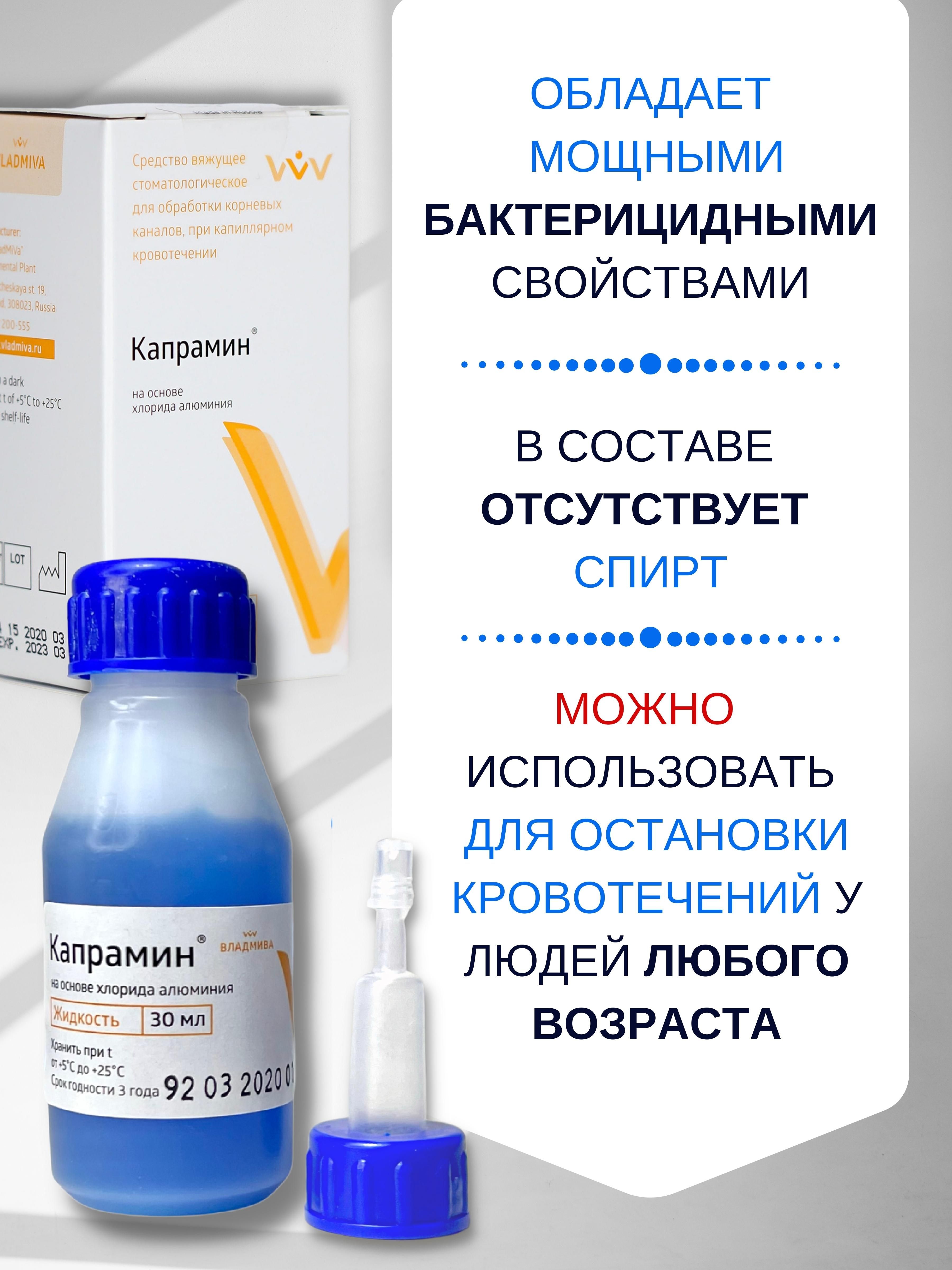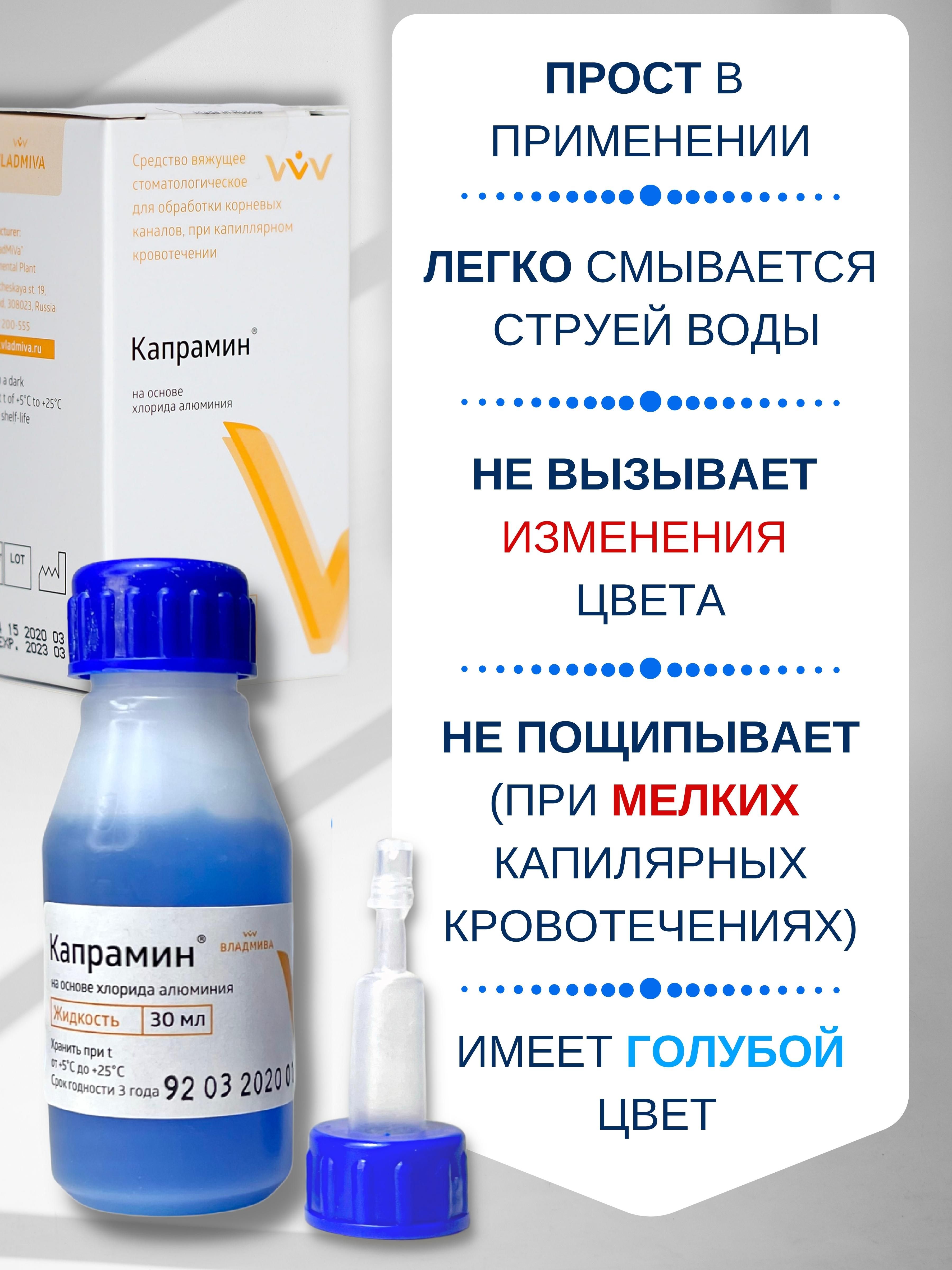 Описание: Препарат Капрамин применяется как кровоостанавливающее, гемостатическое средство при капиллярном кровотечении, что делает его незаменимым средством первой помощи во время маникюра/педикюра. Быстро останавливает кровь и обладает бактерицидными свойствами. «Капрамин» не токсичен, прост в применении, легко смывается струей воды. Часто используется в стоматологии. Хранить в темном месте при температуре от +5°C до +25°C. Срок годности: 3 года.