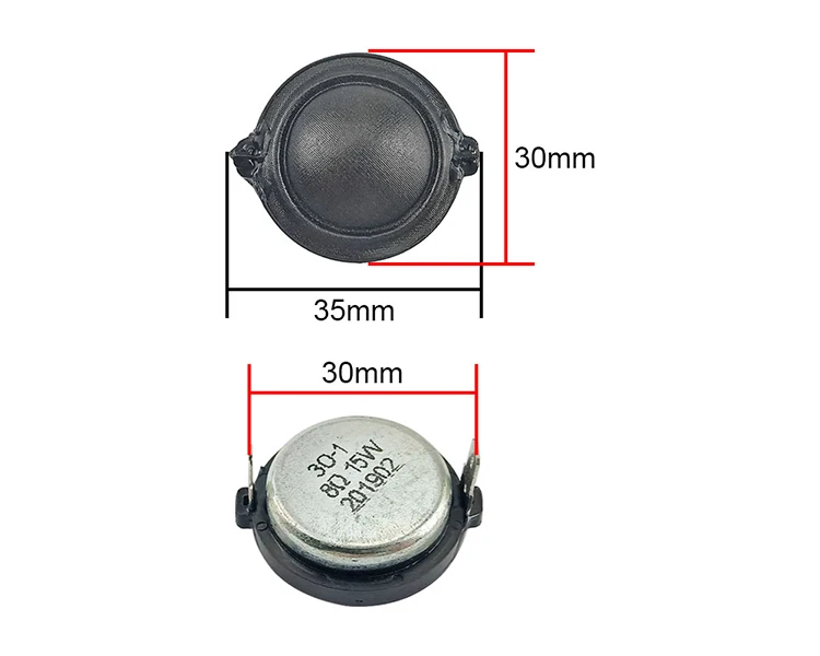 Размер рамы: общая ширина 31 мм, Толщина 15 мм, неодимовый магнит звуковой катушки 20 мм, 8 Ом, 15 Вт