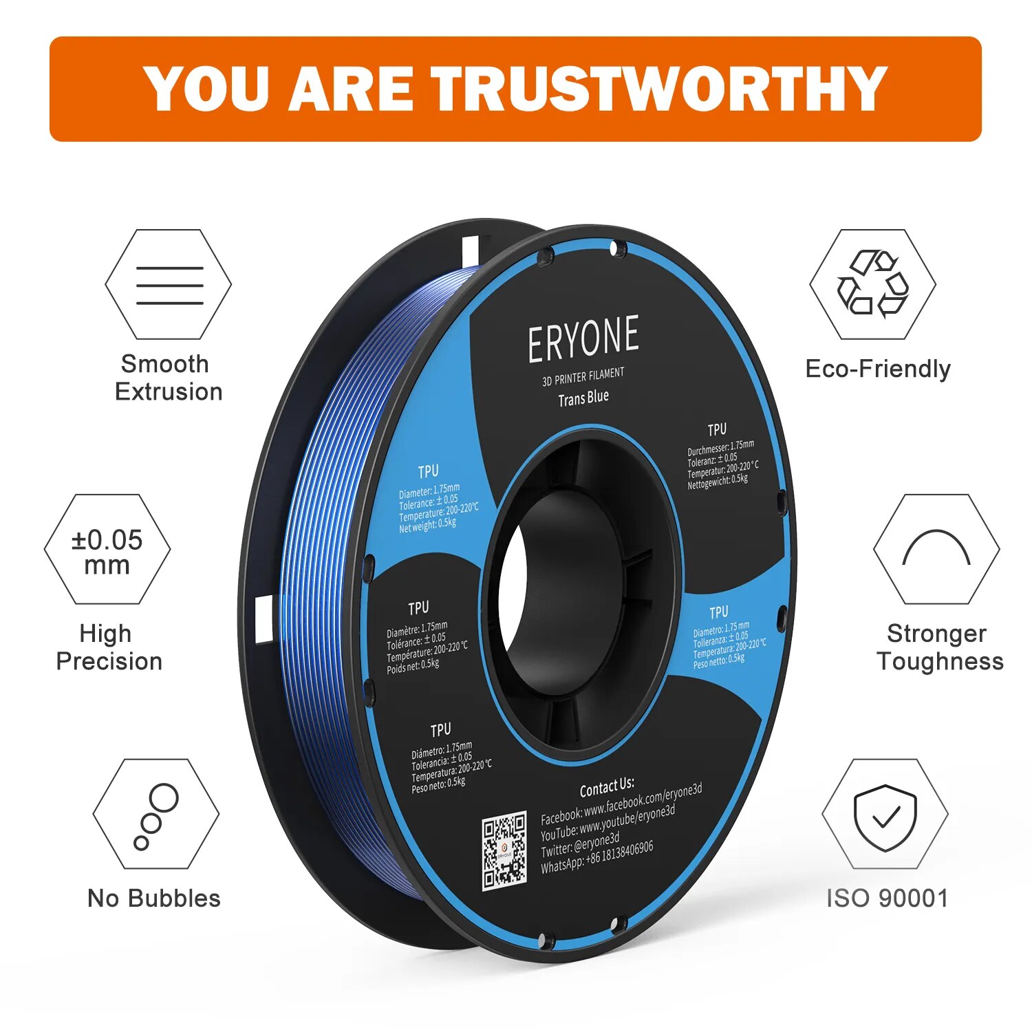 Eryone Promotion Гибкая нить TPU 1,75 мм 3D-печать Нить TPU для 3D-принтера, 1 Катушка, прозрачная 0,5 кг Бесплатная доставка