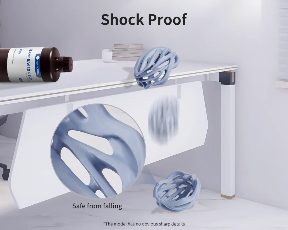 Детали, напечатанные с помощью гибкой прочной смолы Anycubic, устойчив к ударам и демонстрируют высокую ударную вязкость. Кроме того, он может выдерживать высокие удары и другое Высокопрочное механическое давление.