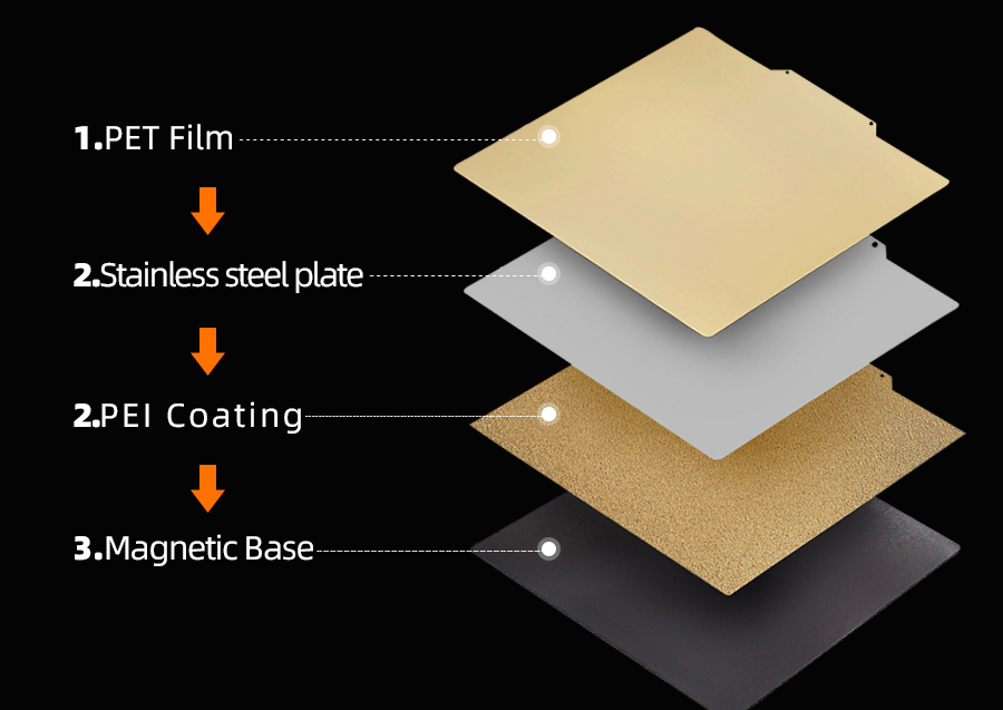 ④ Двусторонняя текстура PEI + Гладкая ПЭТ-пленка из пружинной стали * 1 (одна сторона покрыта силовым покрытием PEI, а другая сторона-нанесена ПЭТ-пленка), с магнитным основанием или без него.