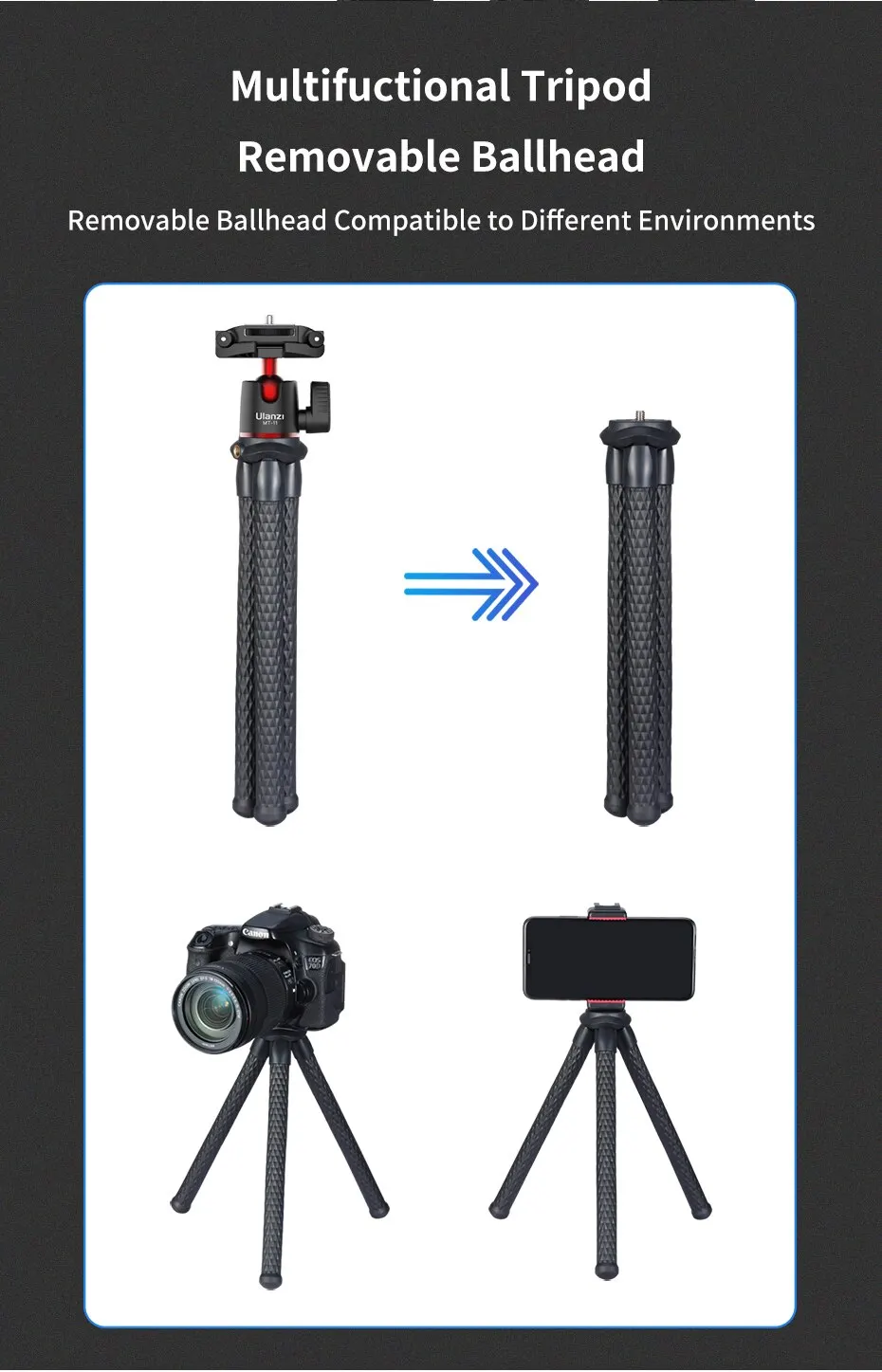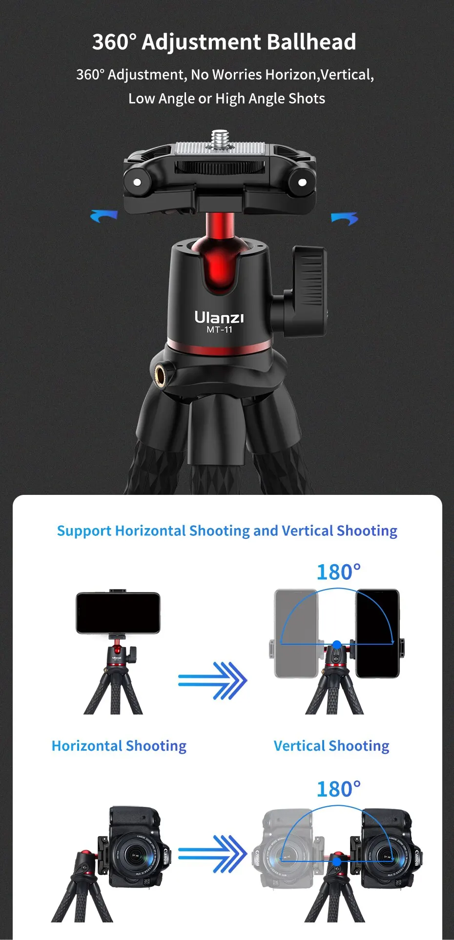 • Гибкий штатив :Гибкий штатив Ulanzi MT-11 Octopus идеально подходит для стабильной съемки кадров под любым углом, что делает его идеальным для видеокамер и цифровых зеркальных фотоаппаратов.
