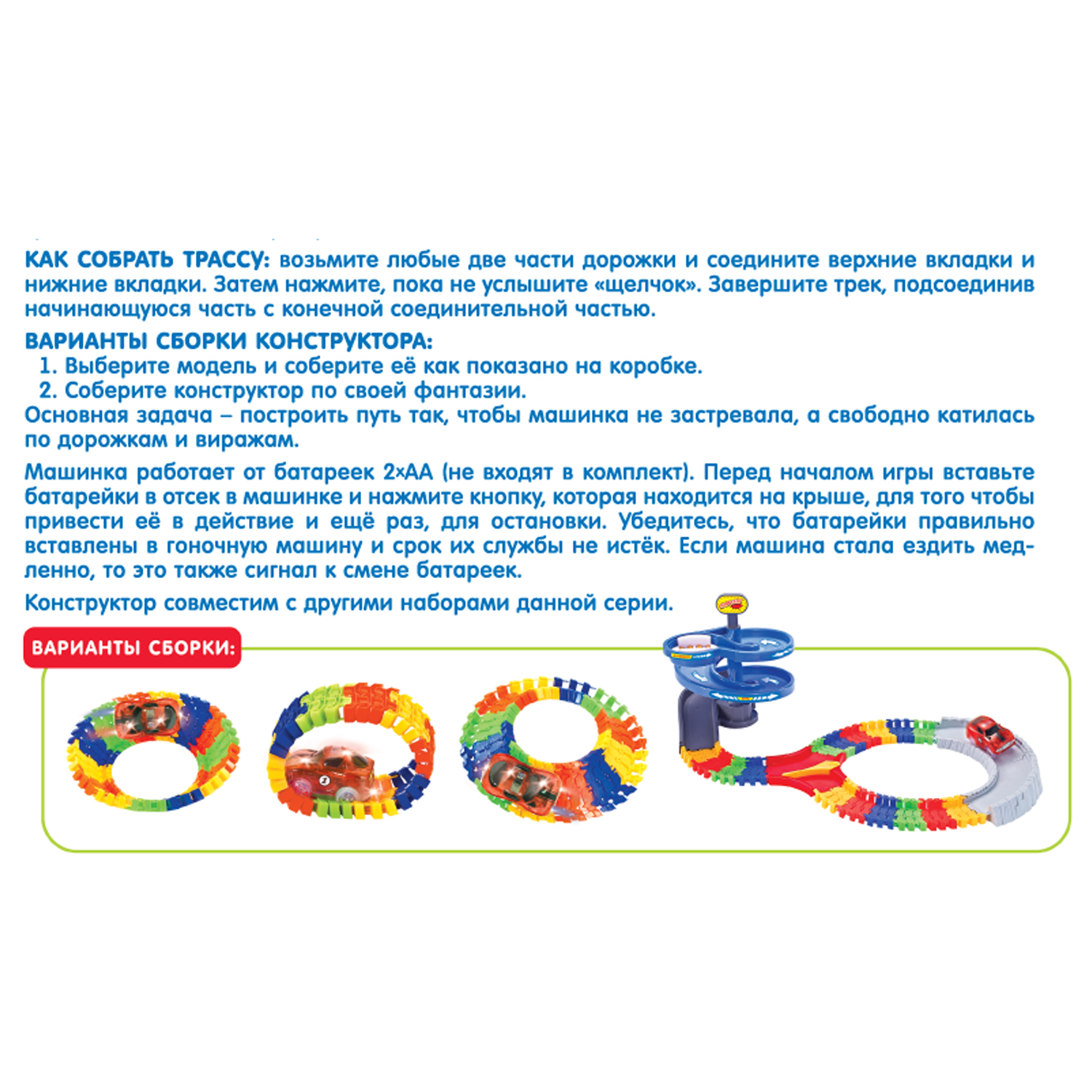 2. Соберите конструктор по своей фантазии. Основная задача - построить путь так, чтобы машинка не застревала, а свободно катилась по дорожкам и виражам. Машинка работает от батареек 1AA (не входят в комплект).