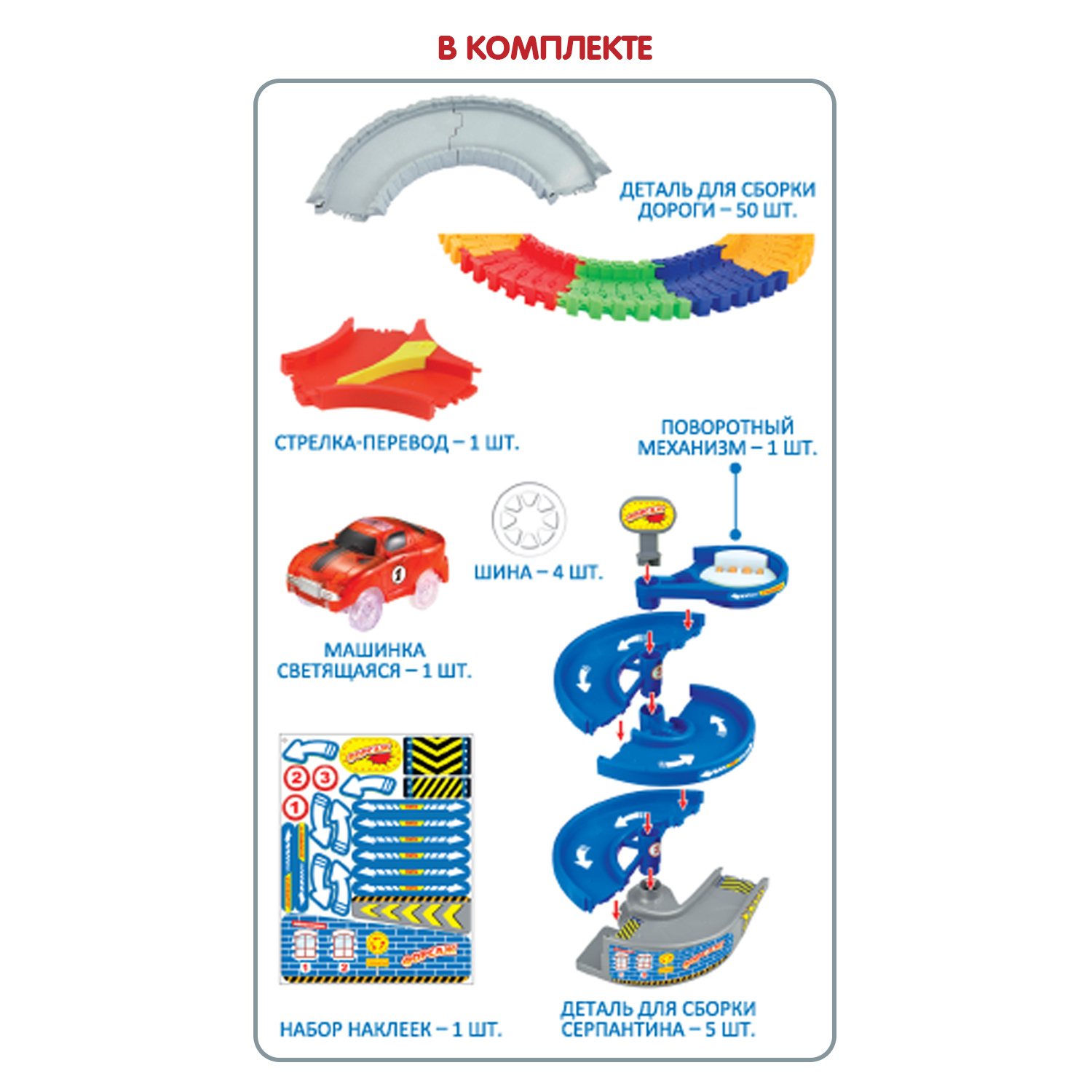 Можно создавать горки и препятствия. Флуоресцентная трасса светится в темноте. Гоночная машинка оснащена яркими светодиодами.
