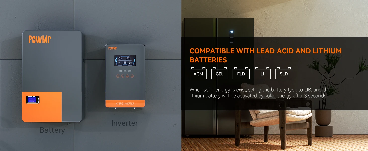 Совместим с несколькими типами батарей:Может сочетаться с различными типами аккумуляторов, такими как AGM, GEL, FLD, SLD, LI, USER. Правильная батарея для инвертора может максимизировать эффективность зарядки, обеспечить скорость зарядки и продлить срок службы батареи. (Примечание: если вы используете литиевую батарею, выберите тип батареи «Определяемый пользователем» в программе 05, чтобы настроить ее).