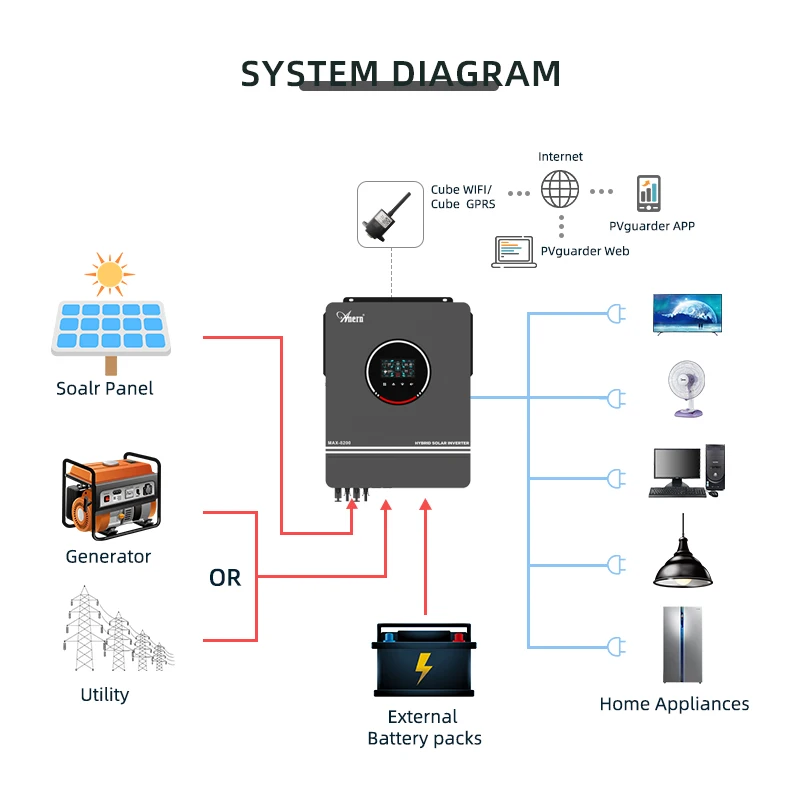 Чтобы добиться стабильной работы солнечной системы и сэкономить на счетах за электроэнергию, рекомендуется подключить аккумулятор; Когда режим установлен на SBU, система будет сначала использовать Фотоэлектрический Модуль и аккумулятор, а утилиту-в последнюю очередь.