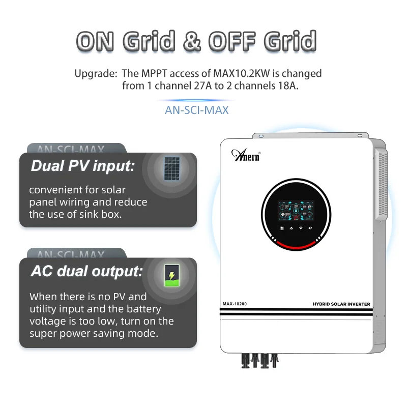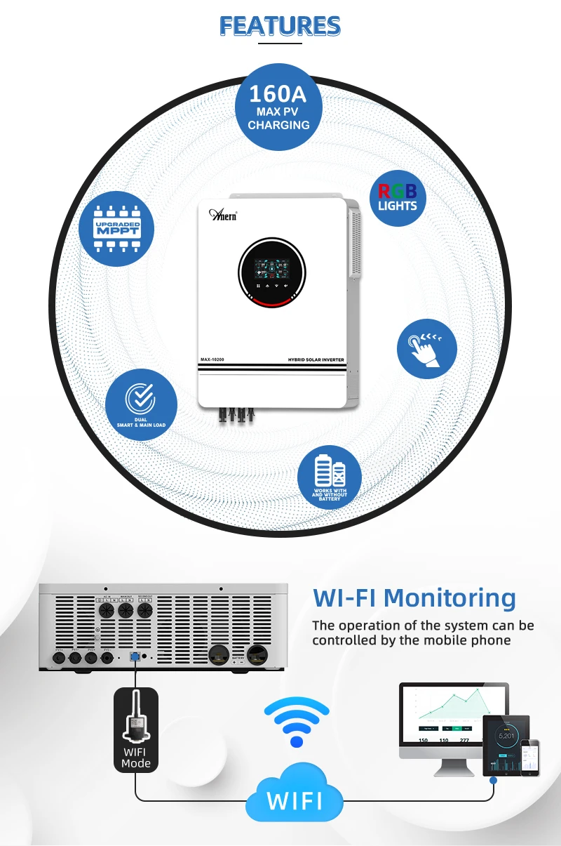 Гибридный солнечный инвертор Anern 10.2KW 8.2KW 48V Фотогальванический Гибридный инвертор 230VAC Max PV 500VDC Встроенное зарядное устройство 140A/160A MPPT